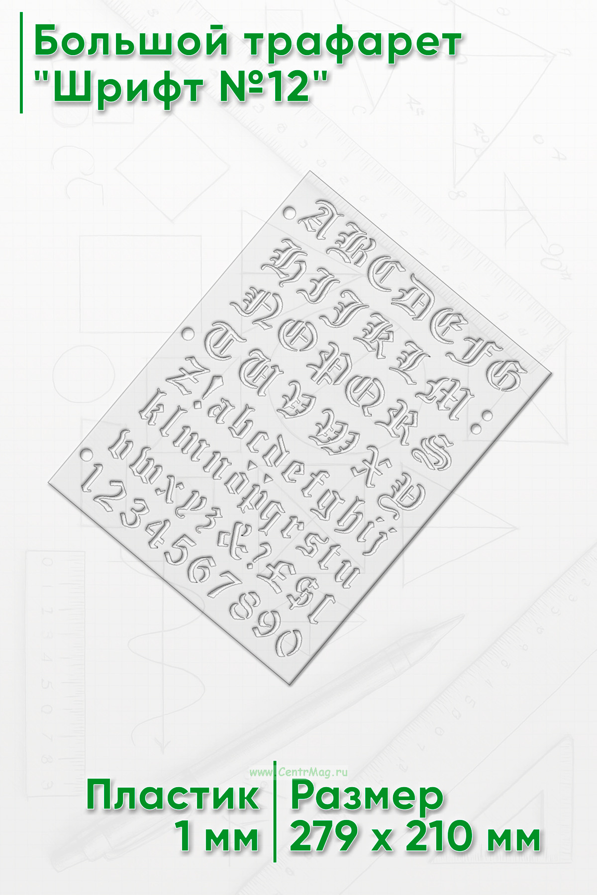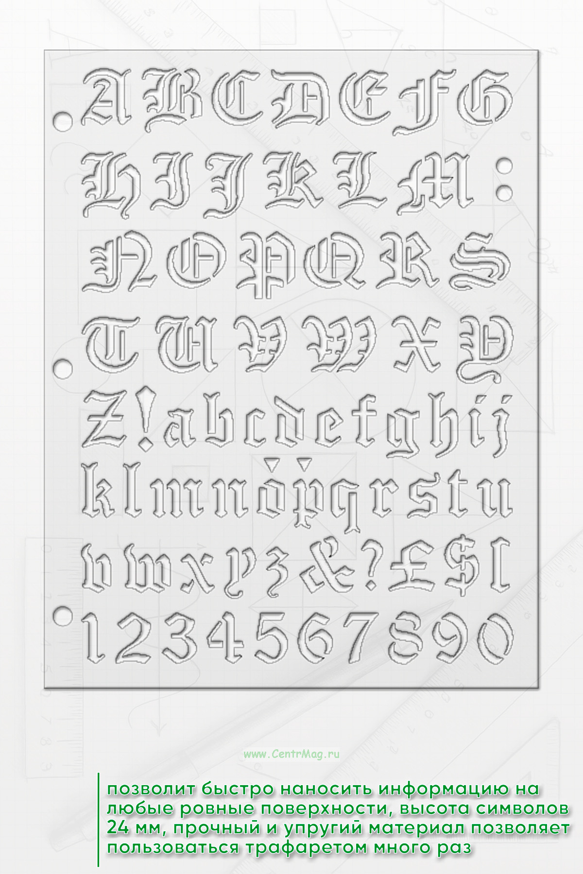 Трафарет позволит быстро наносить информацию на любые ровные поверхности. Высота высота символов 24 мм. Прочный и упругий материал позволяет пользоваться трафаретом много раз. Отверстия сбоку позволяют прикрепить один или несколько трафаретов к планшету или папке.