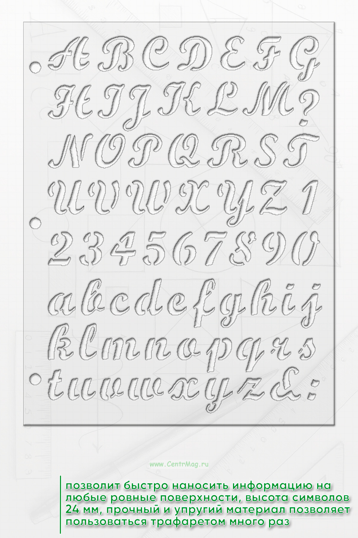 Трафарет позволит быстро наносить информацию на любые ровные поверхности. Высота высота символов 24 мм. Прочный и упругий материал позволяет пользоваться трафаретом много раз. Отверстия сбоку позволяют прикрепить один или несколько трафаретов к планшету или папке.