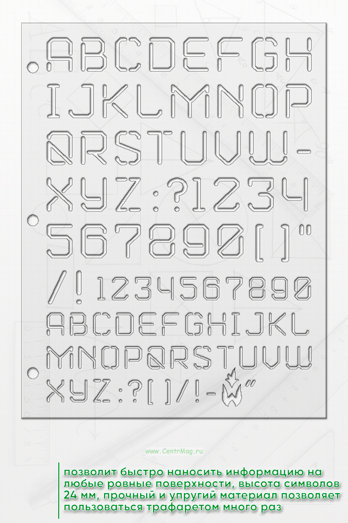 Трафарет позволит быстро наносить информацию на любые ровные поверхности. Высота высота символов 24 мм. Прочный и упругий материал позволяет пользоваться трафаретом много раз. Отверстия сбоку позволяют прикрепить один или несколько трафаретов к планшету или папке.