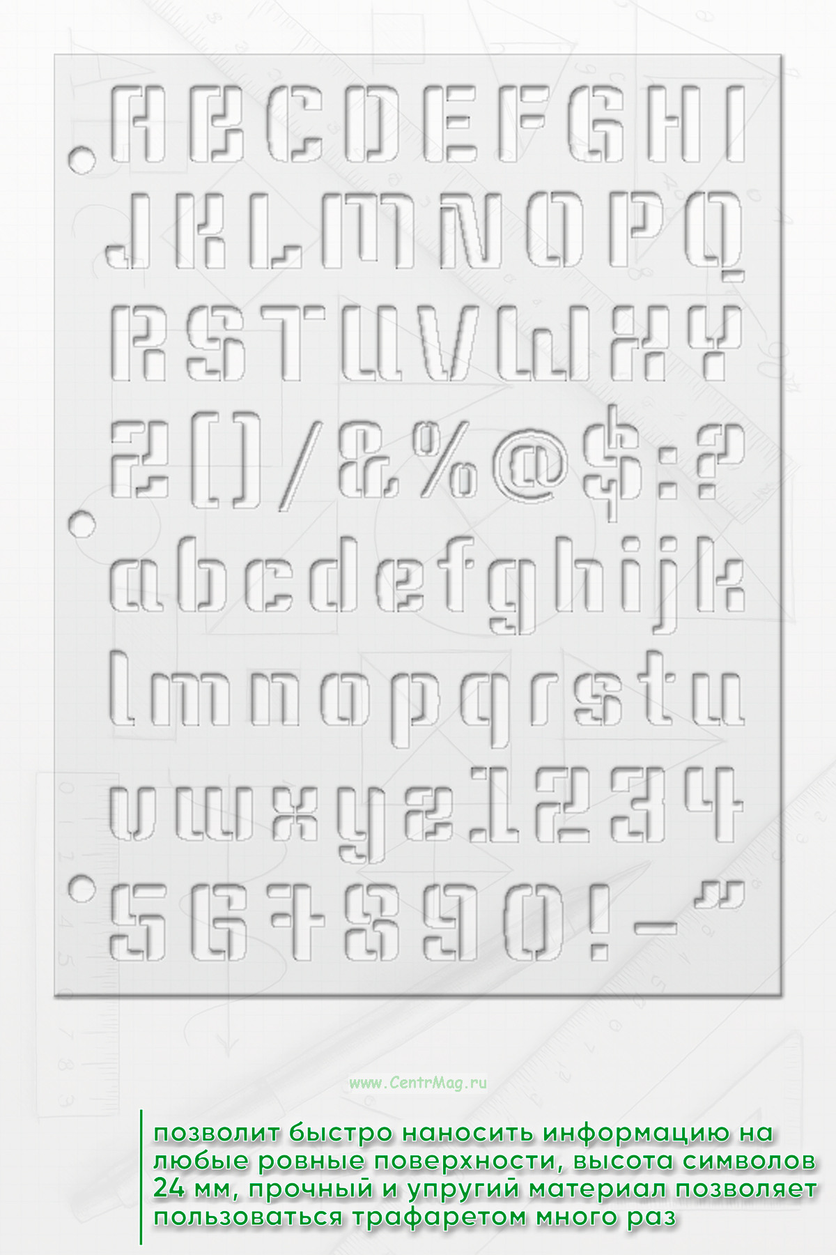 Трафарет позволит быстро наносить информацию на любые ровные поверхности. Высота высота символов 24 мм. Прочный и упругий материал позволяет пользоваться трафаретом много раз. Отверстия сбоку позволяют прикрепить один или несколько трафаретов к планшету или папке.