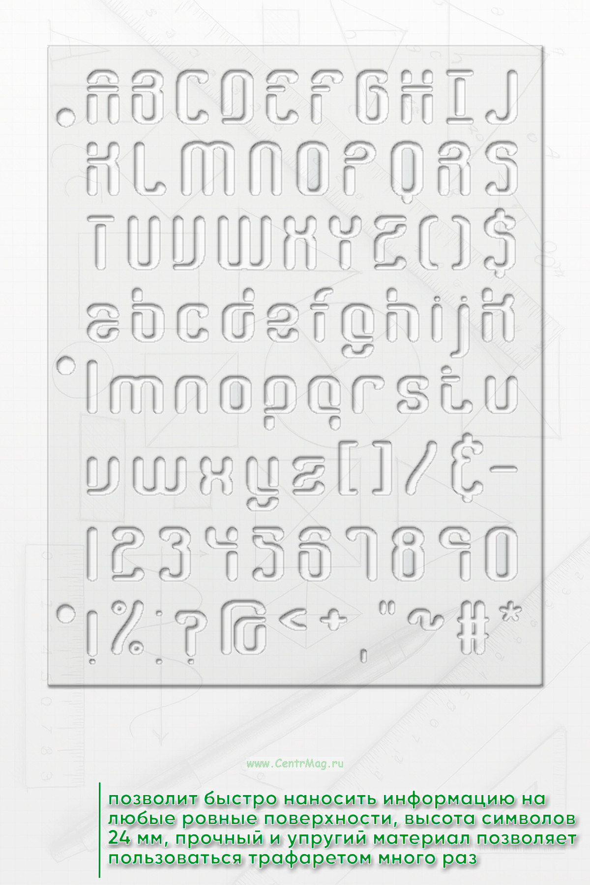 Трафарет позволит быстро наносить информацию на любые ровные поверхности. Высота высота символов 24 мм. Прочный и упругий материал позволяет пользоваться трафаретом много раз. Отверстия сбоку позволяют прикрепить один или несколько трафаретов к планшету или папке.