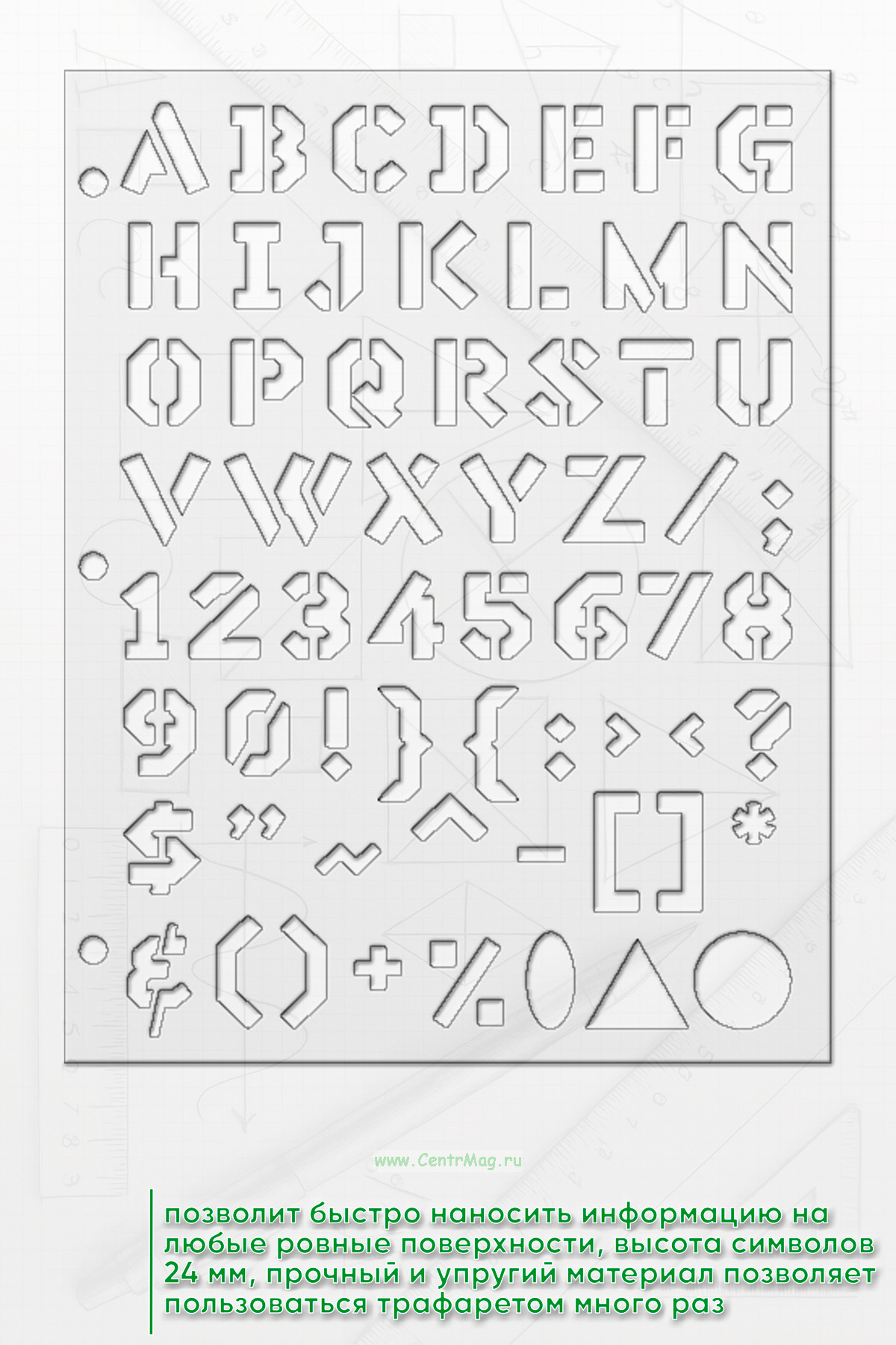 Трафарет позволит быстро наносить информацию на любые ровные поверхности. Высота символов 24 мм.Прочный и гибкий материал позволяет пользоваться трафаретом много раз. Отверстия сбоку позволяют прикрепить один или несколько трафаретов к планшету или папке.