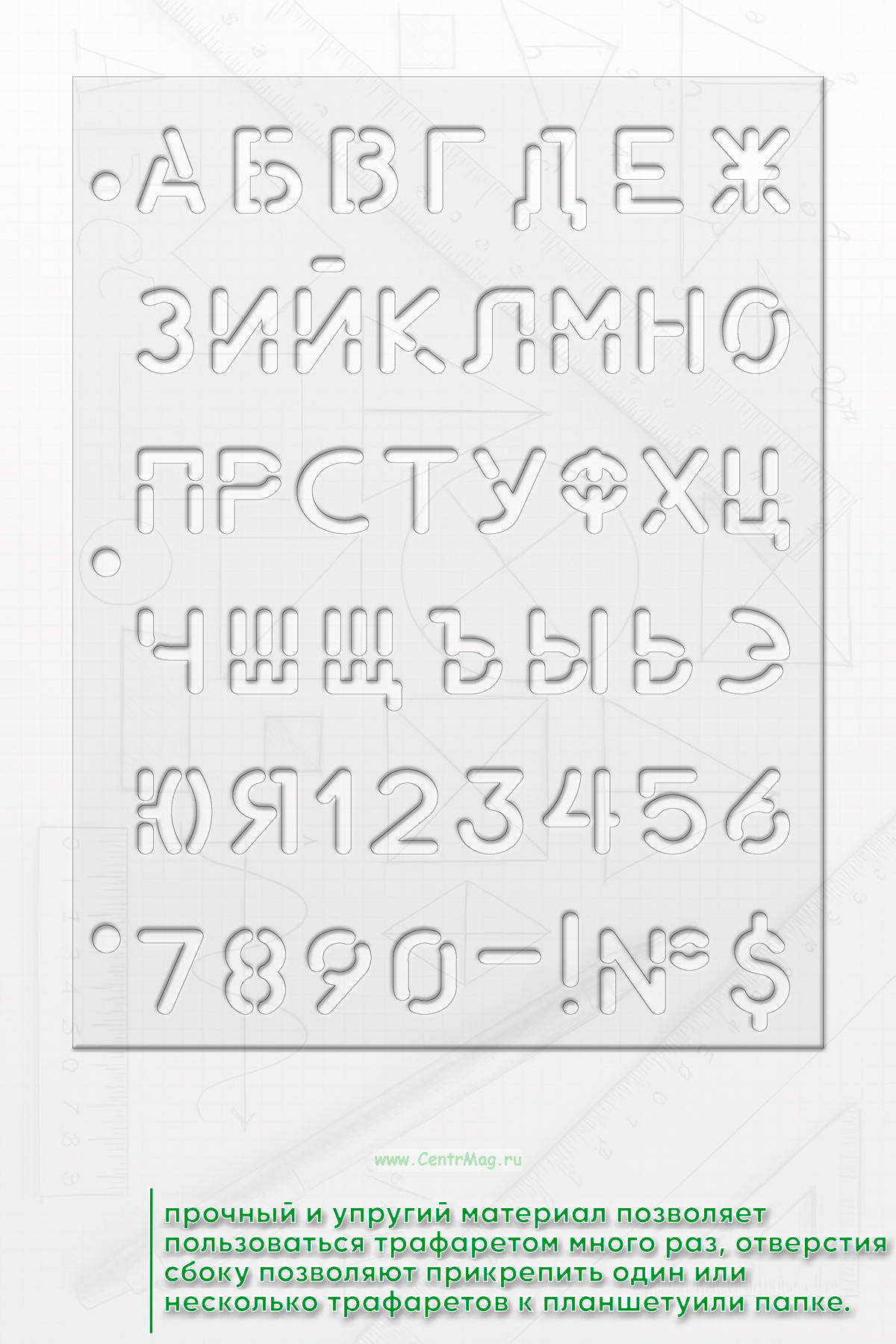 Шрифт для маркировки грузов соответствует ГОСТу 14192-96 (Приложение Г3). Прочный и упругий материал позволяет пользоваться трафаретом много раз. Отверстия сбоку позволяют прикрепить один или несколько трафаретов к планшету или папке.