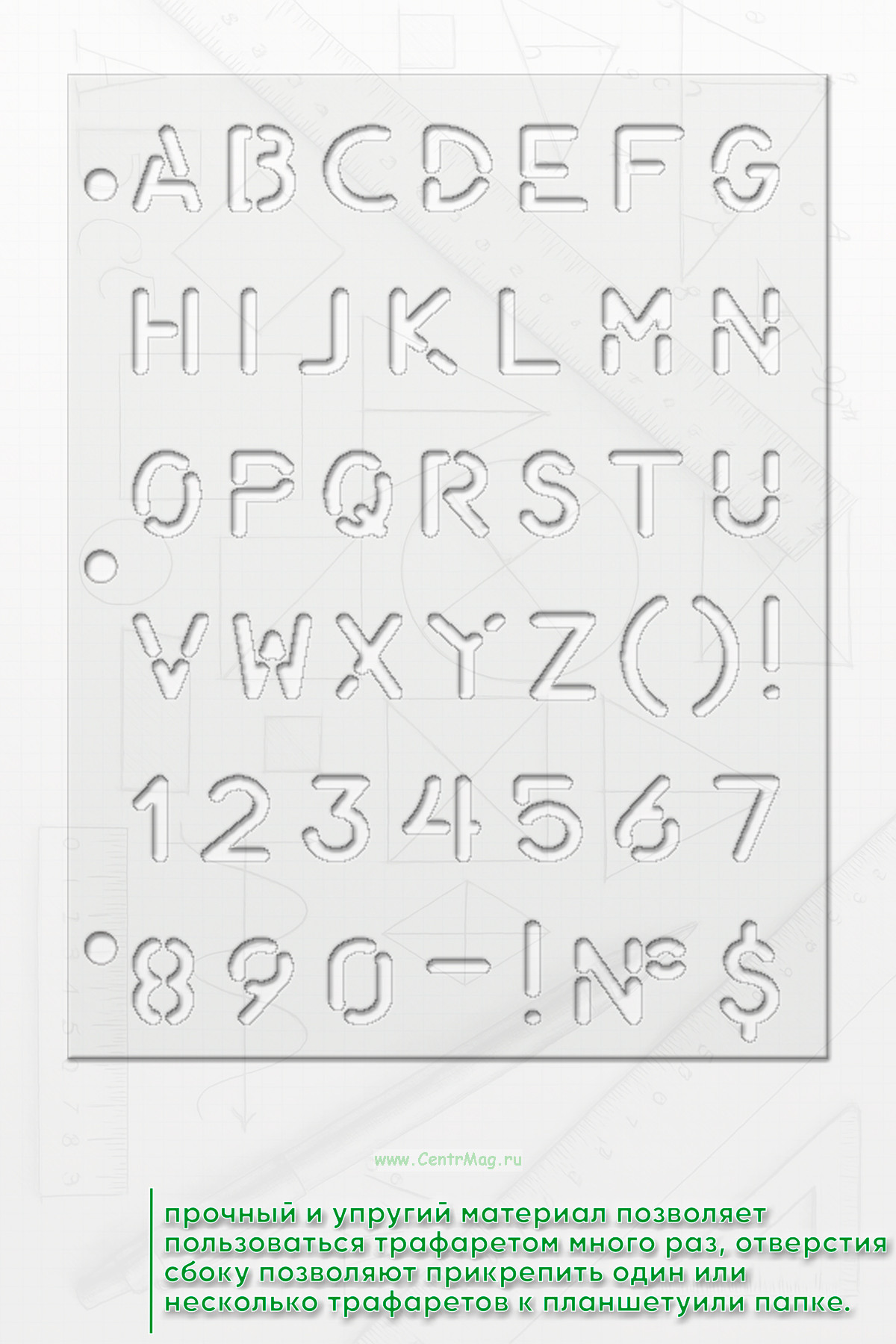 Шрифт для маркировки грузов соответствует ГОСТу 14192-96 (Приложение Г3). Прочный и упругий материал позволяет пользоваться трафаретом много раз. Отверстия сбоку позволяют прикрепить один или несколько трафаретов к планшету или папке.