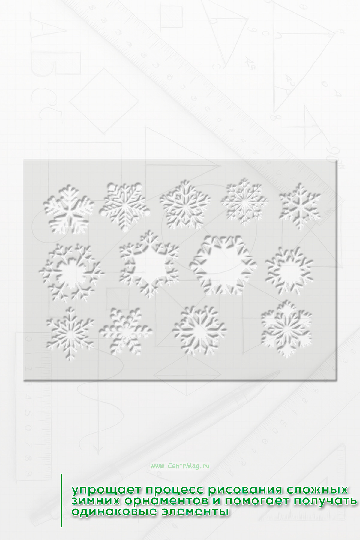 Большой трафарет "Снежинки" предназначен для самостоятельного создания аккуратных и симметричных снежинок в художественных или декоративных работах. Он упрощает процесс рисования сложных зимних орнаментов и помогает получать одинаковые элементы.