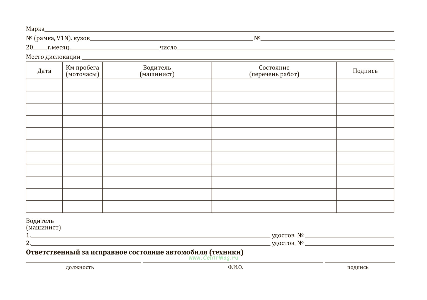 Журнал предназначен для учёта эксплуатации техники: в нём фиксируются дата, пробег или моточасы, сведения о водителе (машинисте), выполненные работы и подписи ответственных лиц. Он помогает контролировать состояние машины и её использование.