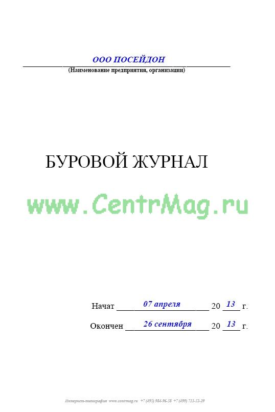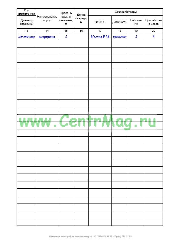 Форма бурового журнала соответвует Приложению 16 к Правилам безопасности ПБ 03-428-02, утвержденных Постановлением Госгортехнадзора РФ от 16.01.2002 N 2, введеных в действие с 1 июля 2002 года.