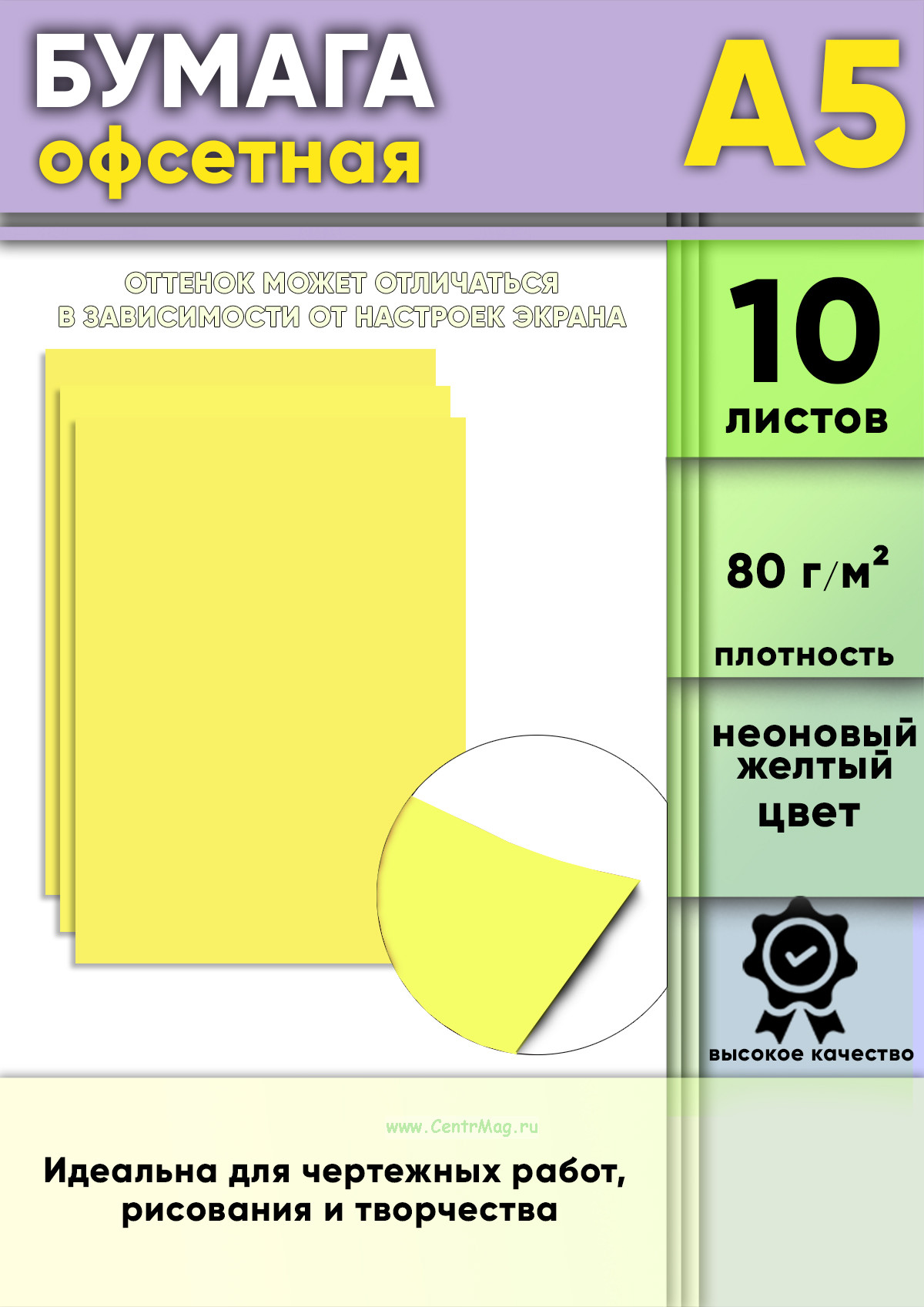 Бумага офсетная, 80 г/м2, А5, "Неоновый желтый", 10 шт