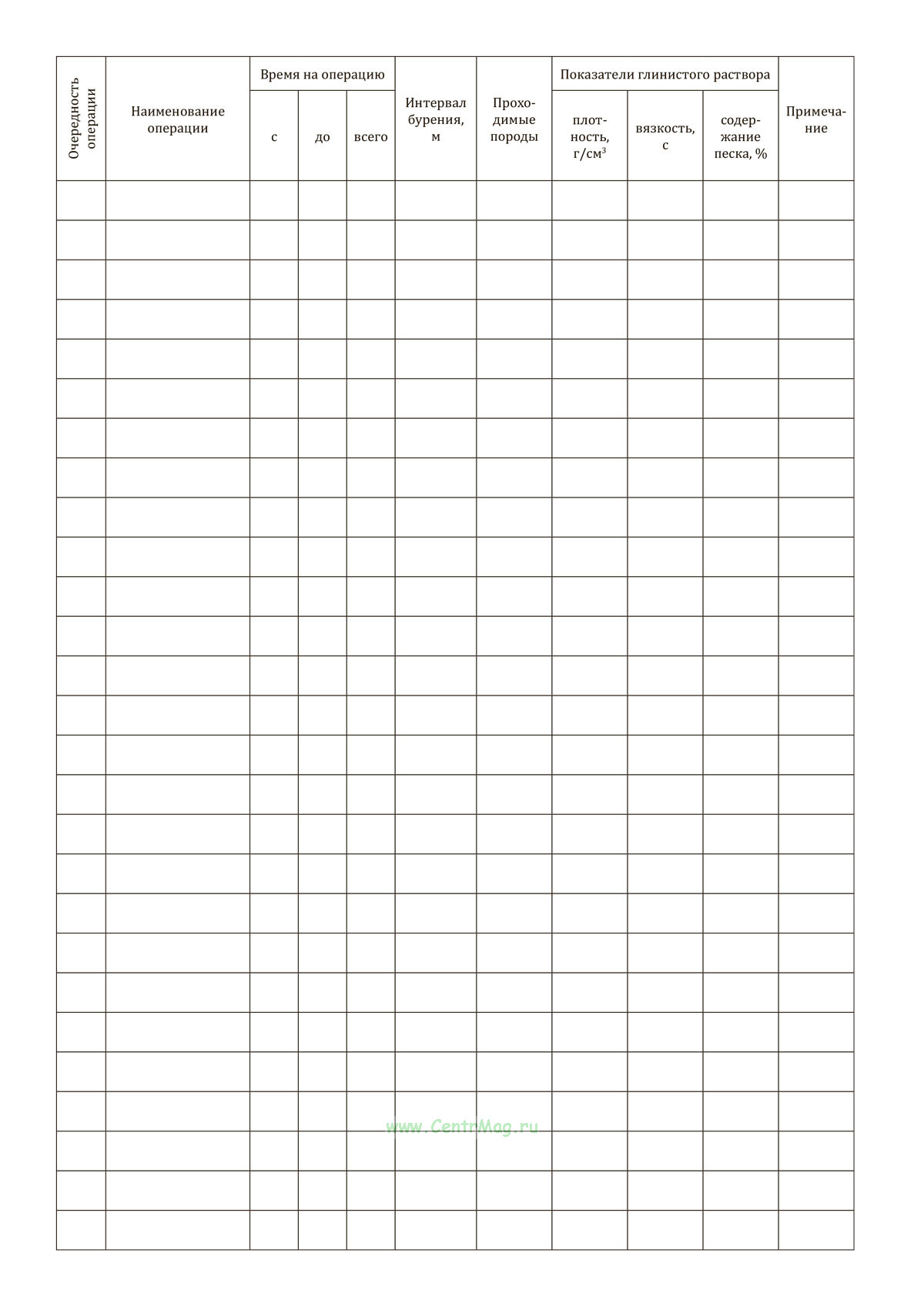 Журнал предназначен для систематической записи всех операций, связанных с процессом бурения скважин. Этот журнал является важным инструментом для анализа эффективности бурения, обеспечения безопасности работ и соблюдения нормативных требований. Кроме того, журнал служит основой для составления отчетов и анализа данных, что позволяет улучшать технологии и методы бурения в будущем.