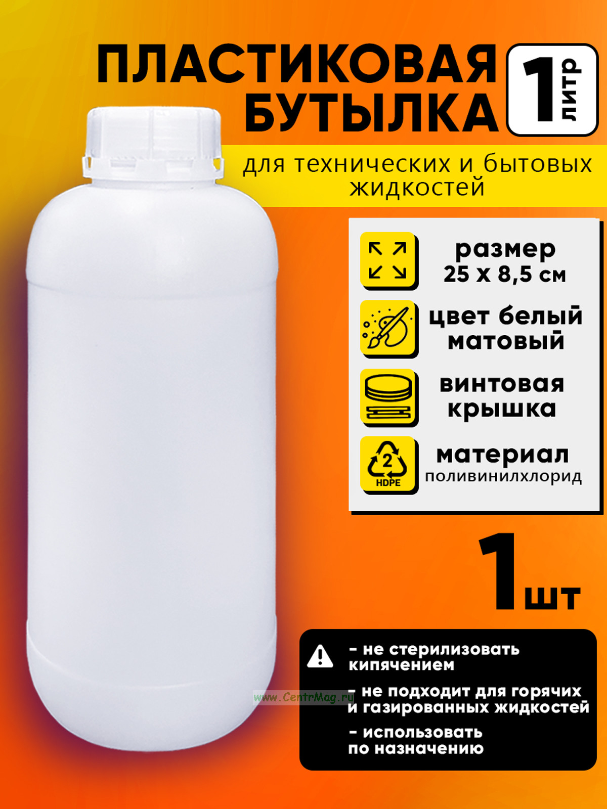 Универсальная пластиковая бутылка объёмом 1 литр из прочного ПЭТ-2 (полиэтилентерефталат). Подходит для хранения и транспортировки технических и бытовых жидкостей. Широко применяется в быту, на производстве, в сельском хозяйстве, лабораториях и мастерских.
