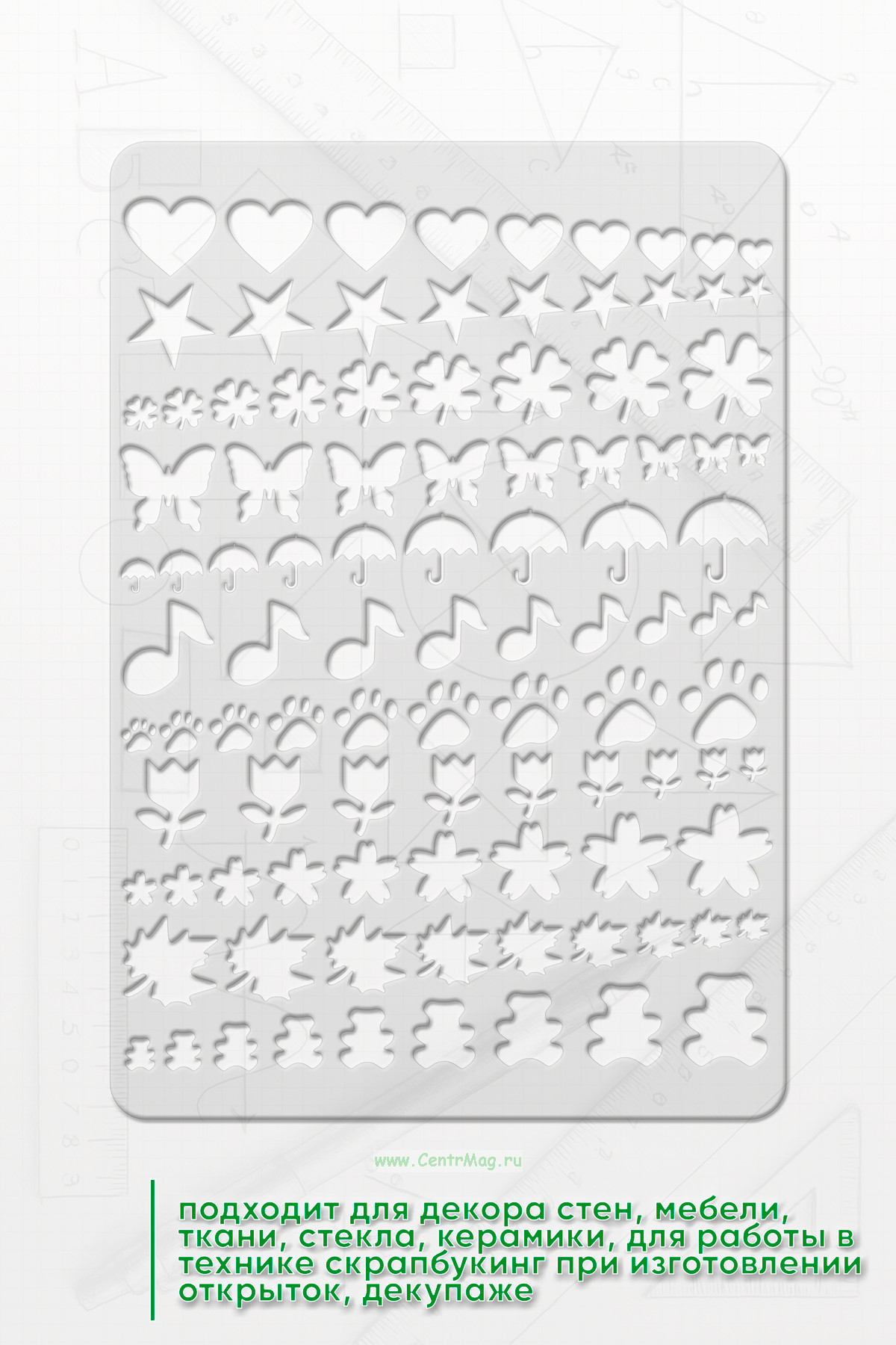 Трафарет подходит для декора стен, мебели, ткани, стекла, керамики, для работы в технике скрапбукинг при изготовлении открыток, декупаже