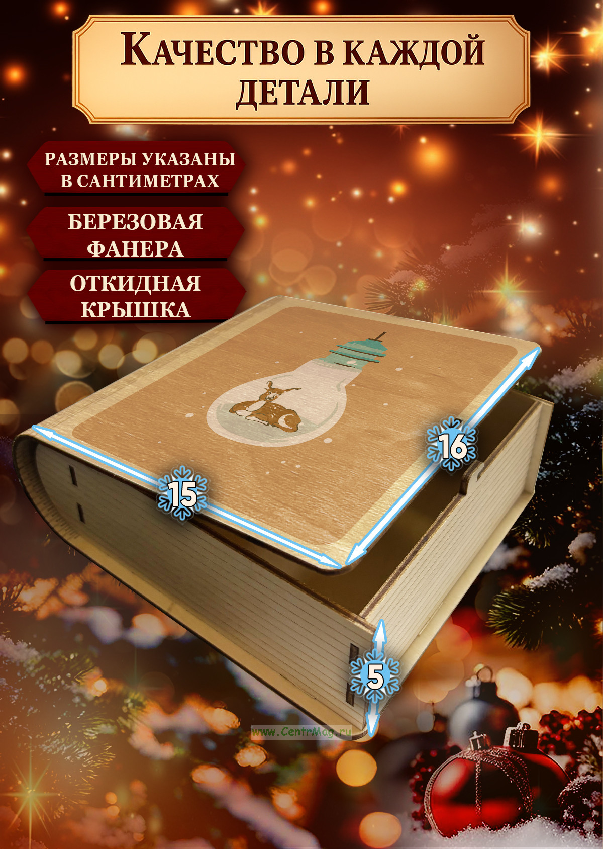 Оригинальная шкатулка-книга из дерева - стильное и практичное решение для хранения или упаковки подарков. Изготовлена из натуральной берёзовой фанеры, изделие выглядит аккуратно и современно. Крышка открывается как обложка книги, а прочные стенки обеспечивают надежность при хранении.
