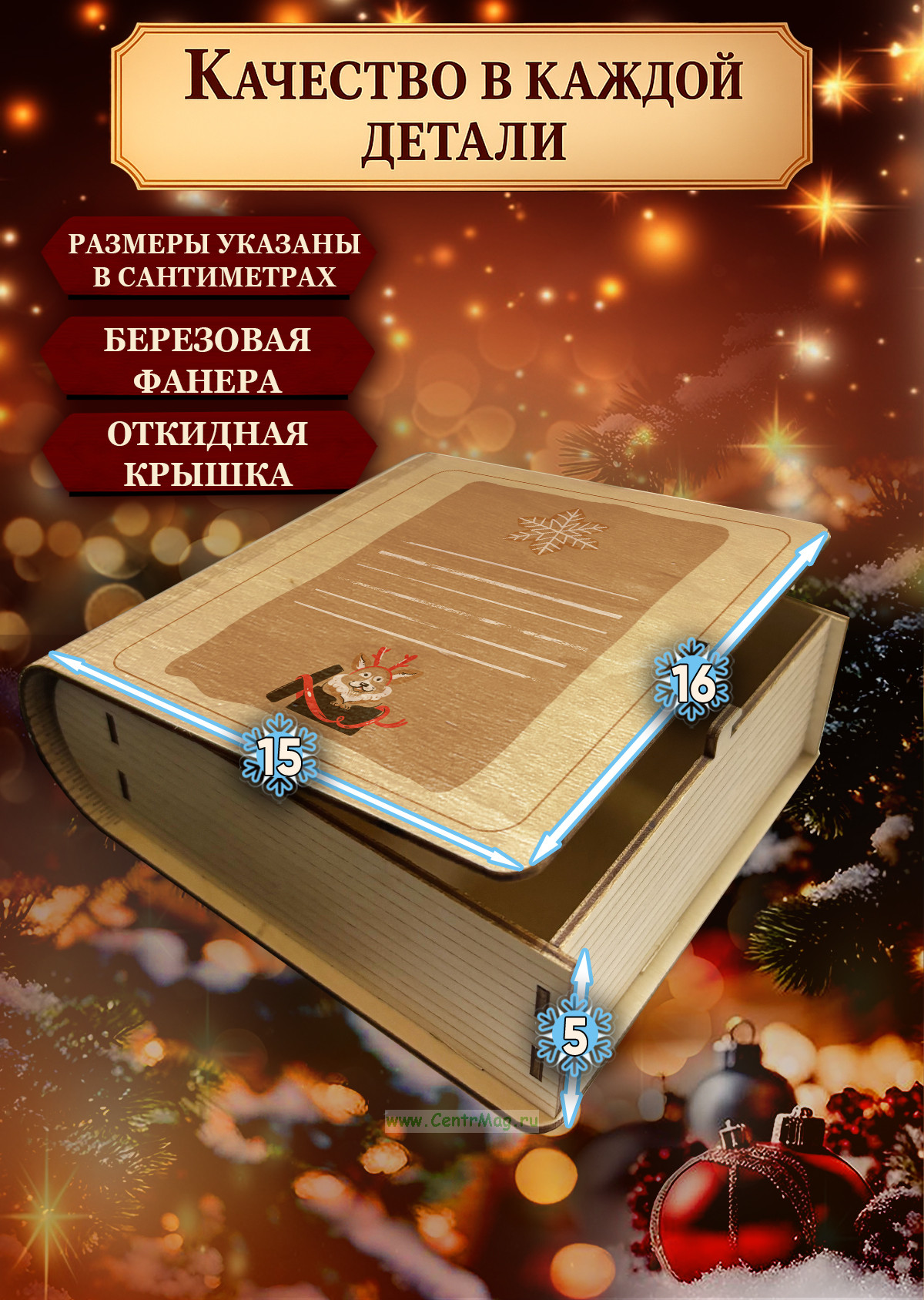 Оригинальная шкатулка-книга из дерева - стильное и практичное решение для хранения или упаковки подарков. Изготовлена из натуральной берёзовой фанеры, изделие выглядит аккуратно и современно. Крышка открывается как обложка книги, а прочные стенки обеспечивают надежность при хранении.