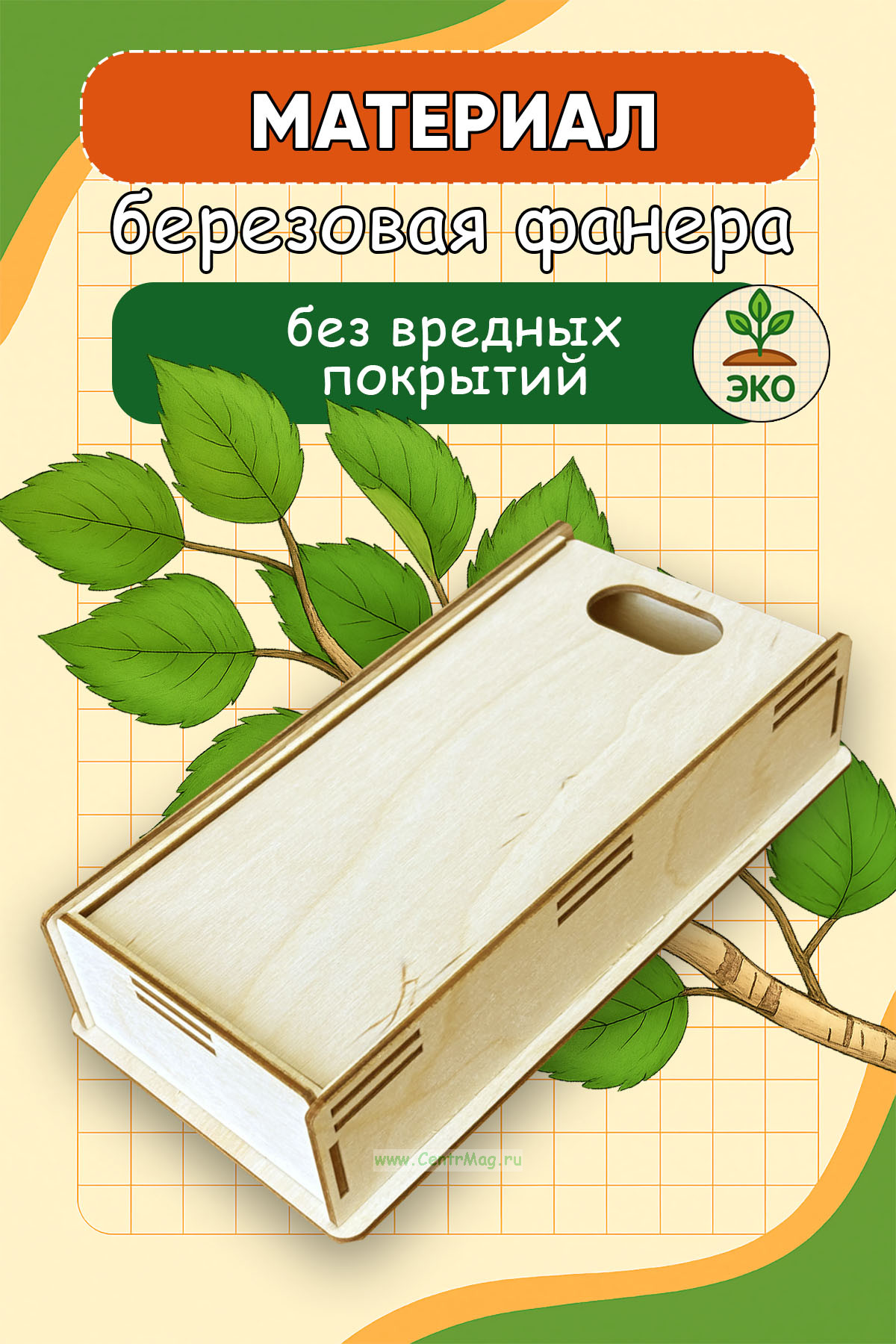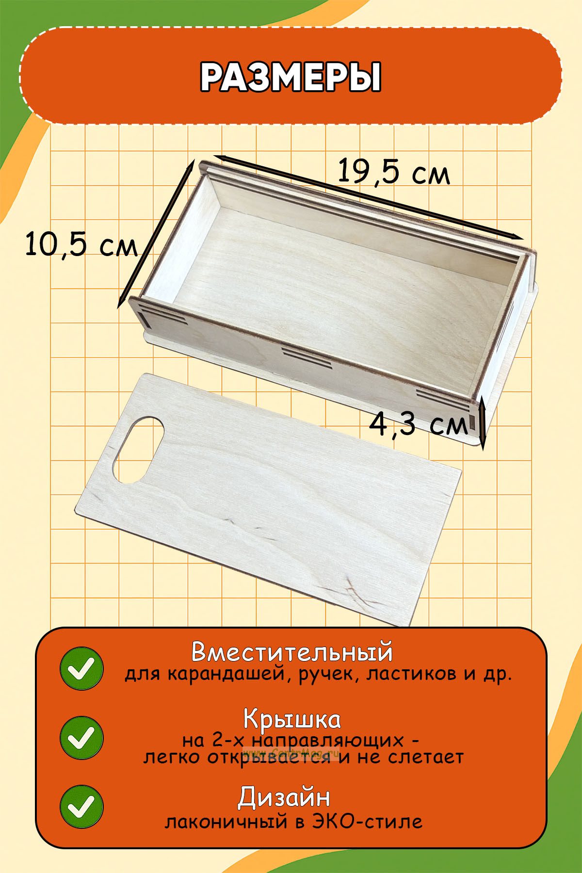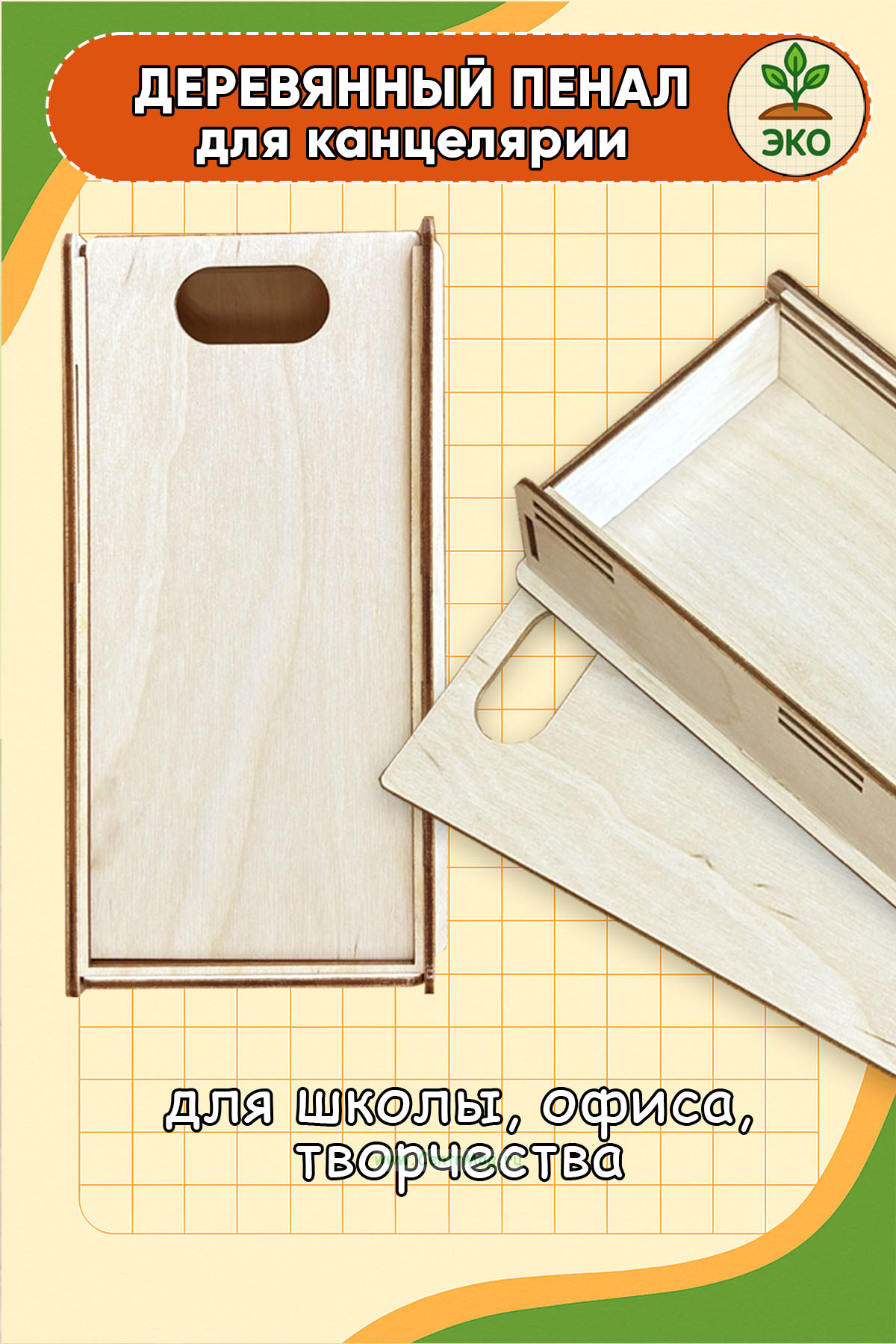 Изготовленный из прочной березовой фанеры, он надежно защищает содержимое, не боится ежедневного использования и отлично сочетается с любым интерьером. Натуральный материал, минималистичный дизайн и компактный формат делают этот пенал универсальным и долговечным.