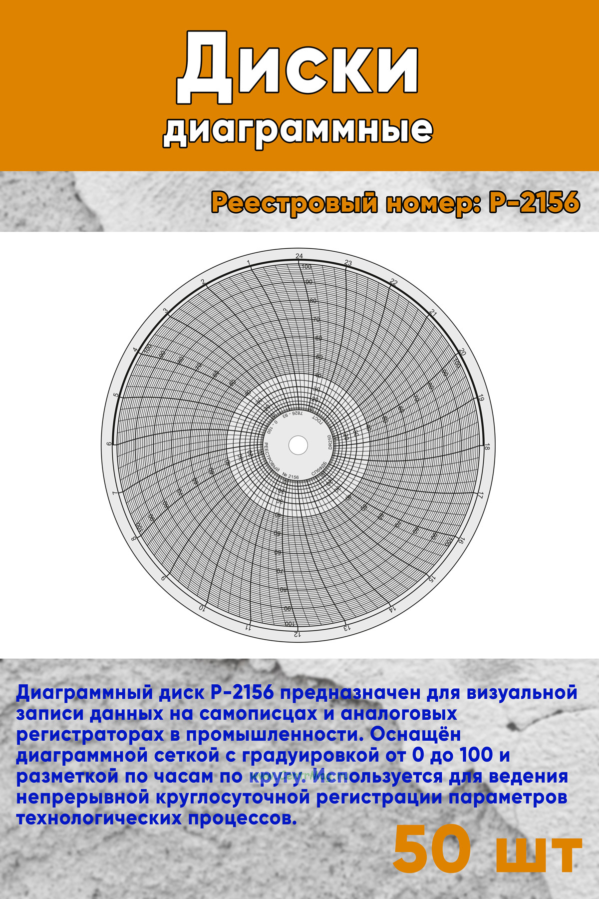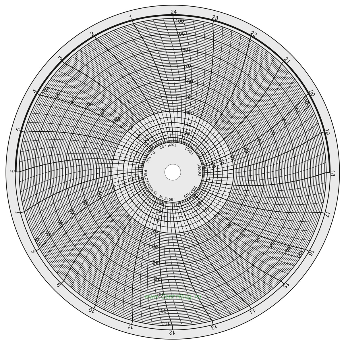 Диаграммный диск P-2156 предназначен для визуальной записи данных на самописцах и аналоговых регистраторах в промышленности. Оснащён диаграммной сеткой с градуировкой от 0 до 100 и разметкой по часам по кругу. Используется для ведения непрерывной круглосуточной регистрации параметров технологических процессов.