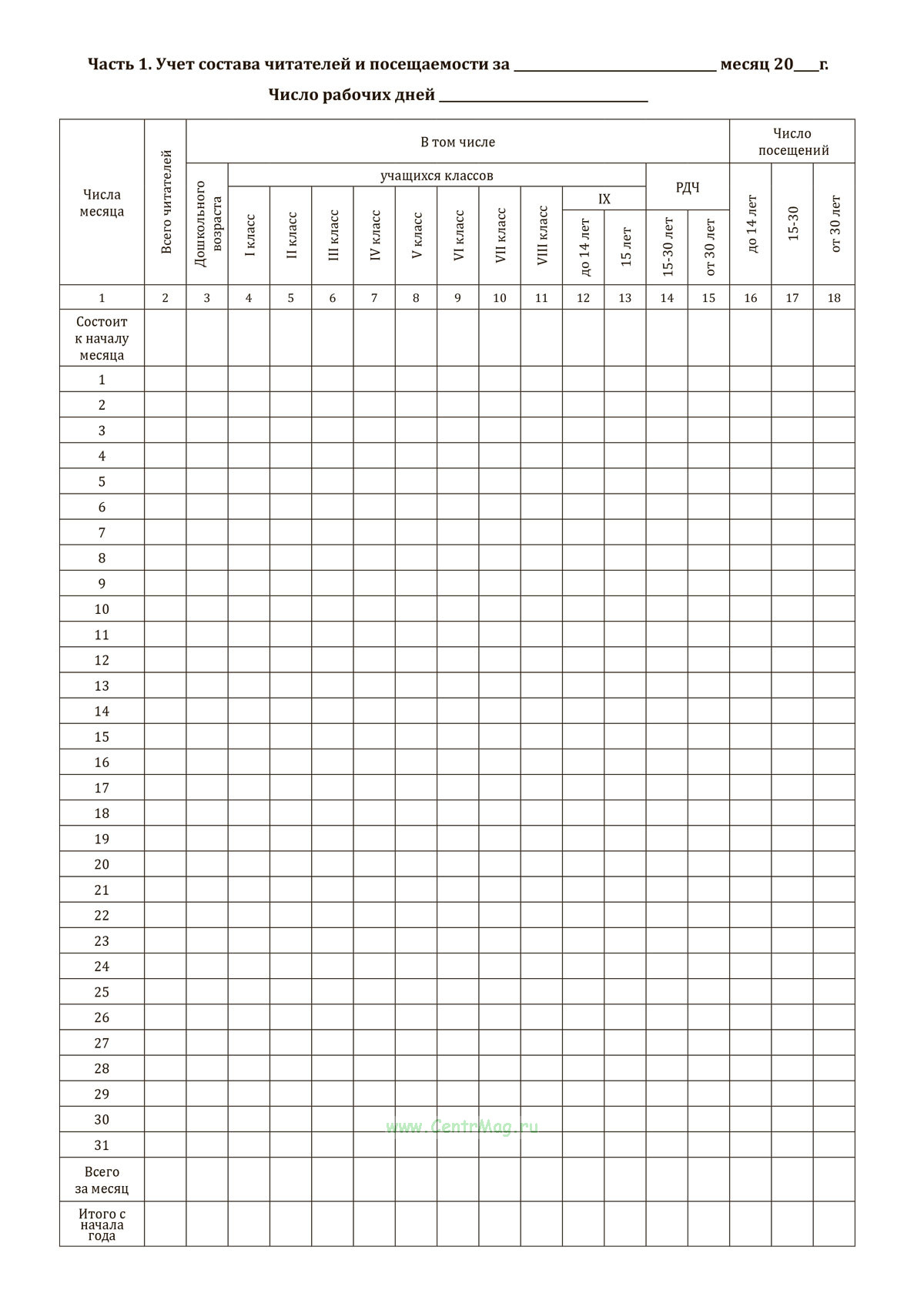 Часть 1. Учет состава читателей и посещаемости за_______________месяц 20__г.