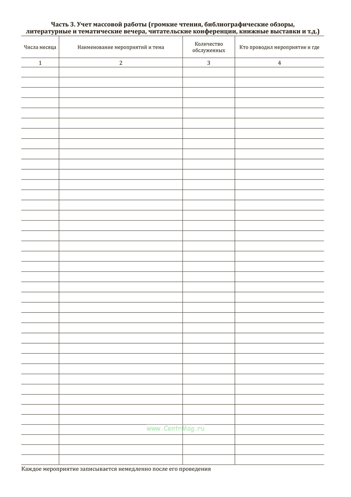 Часть 3. Учет массовой работы (громкие чтения, библиографические обзоры, литературные и тематические вечера, читательские конференции, книжные выставки и т.д.)