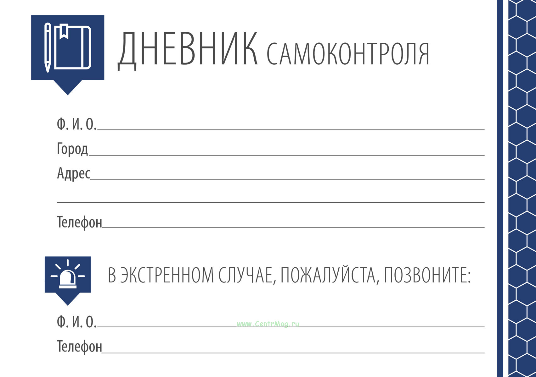 Дневник самоконтроля при сахарном диабете служит для регулярной регистрации показателей уровня глюкозы крови через определённые промежутки времени. Дневник дополнен информационными материалами для пациента, направленными на правильный самоконтроль и профилактику осложнений.