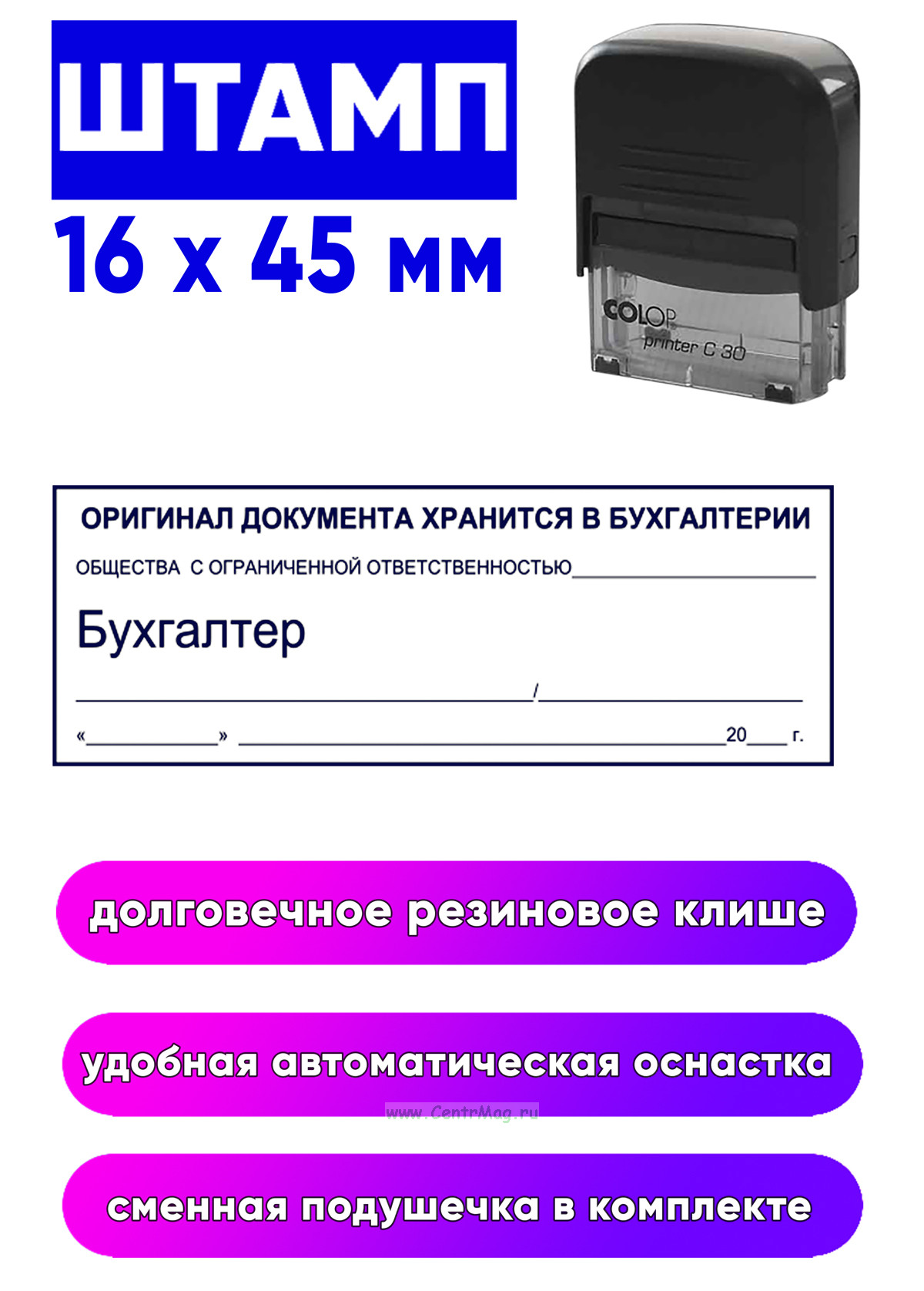 Должностной штамп "Главный бухгалтер. Оригинал документа хранится в бухгалтерии" (1320 руб.)