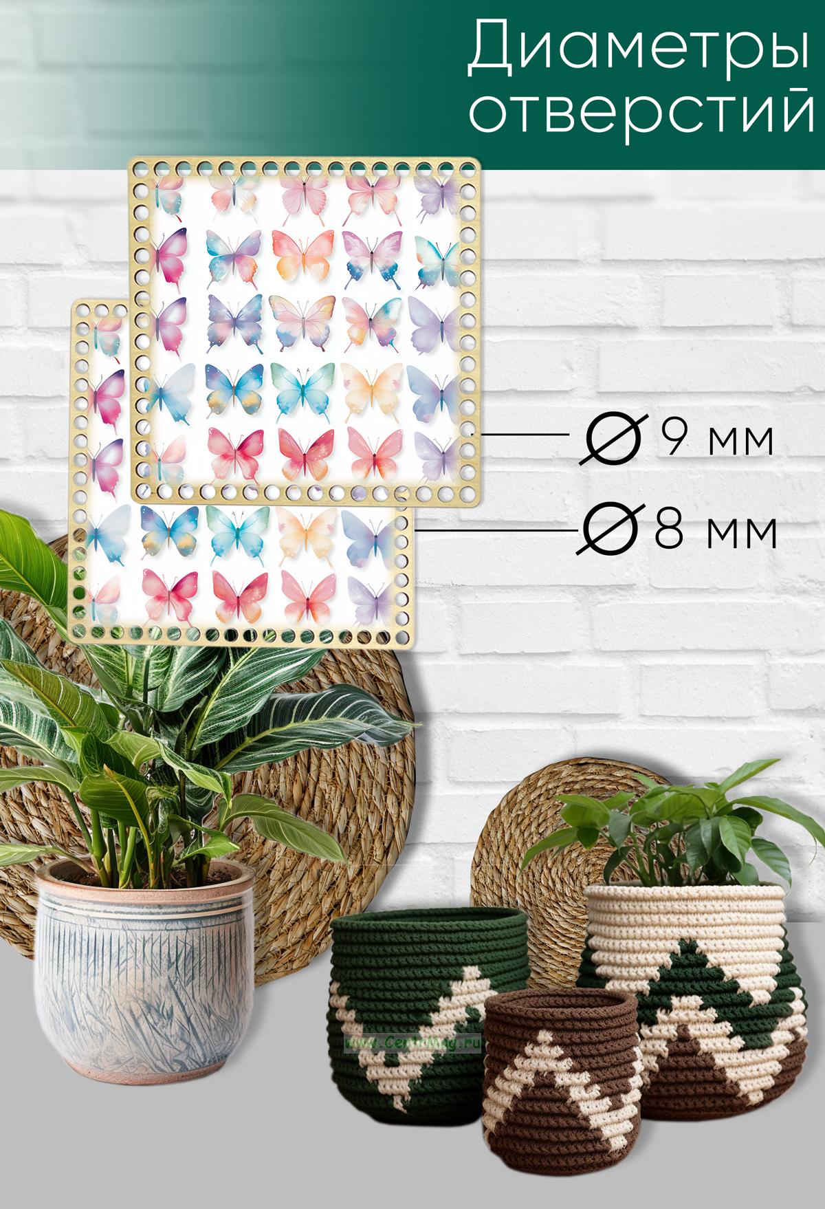 Заготовка сделана из шлифованной березовой фанеры высшего сорта толщиной 3 мм. Такие основы станут отличным каркасом для вашего изделия. Подходят для плетения из шнура, толстых и тонких трикотажных нитей или джута. Также вы можете расписать донышки по своему вкусу. В комплект входит 2 заготовки одинакового размера, но в одном донышке 60 отверстий, а в другом 68. Диаметр отверстий для пряжи 8 и 9 мм.