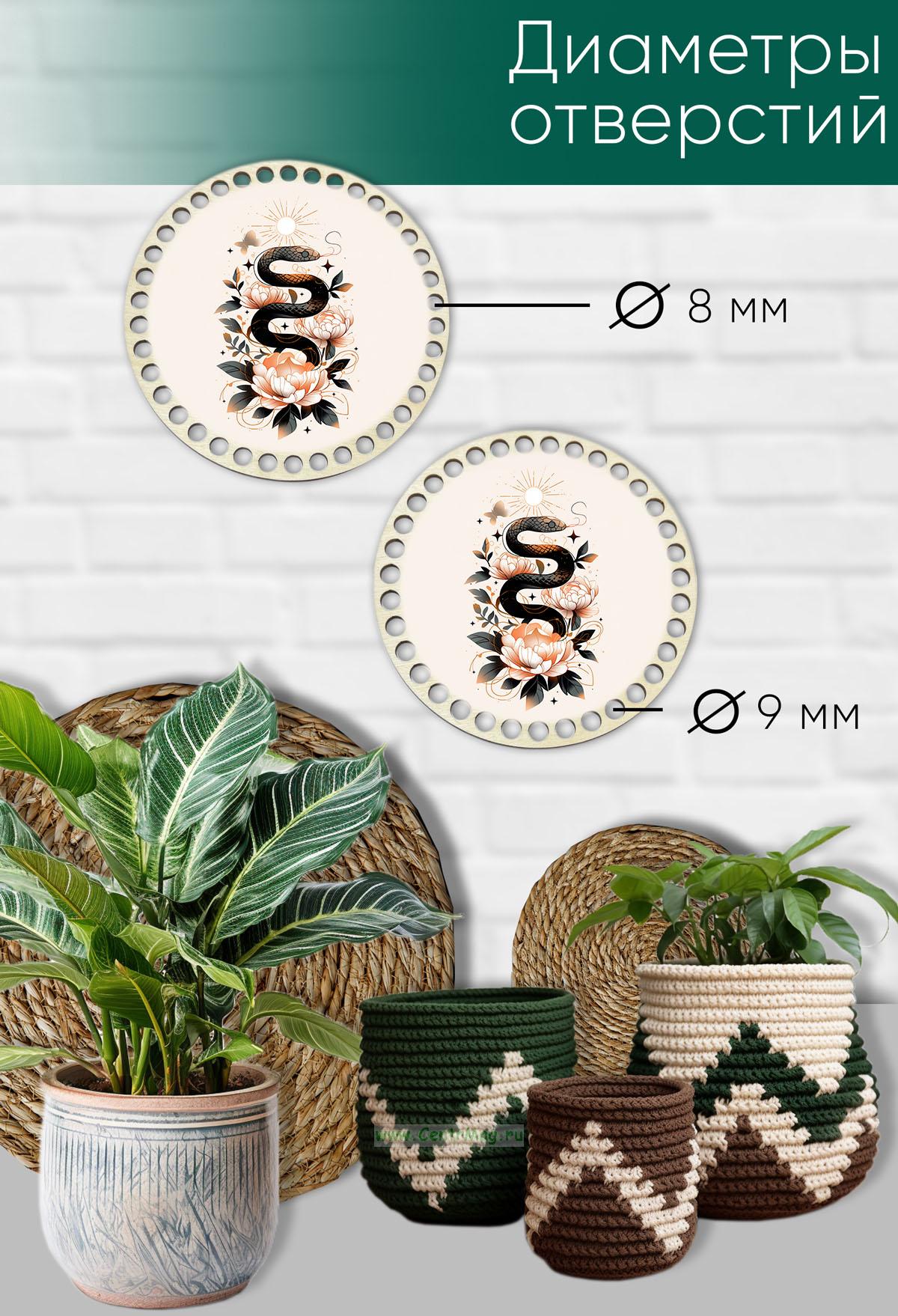 Заготовка сделана из шлифованной березовой фанеры высшего сорта толщиной 3 мм. Такие основы станут отличным каркасом для вашего изделия. Подходят для плетения из шнура, толстых и тонких трикотажных нитей или джута. Также вы можете расписать донышки по своему вкусу. В комплект входит 2 заготовки одинакового диаметра, но в одном донышке 24 отверстия, а в другом 22. Диаметр отверстий для пряжи 8 и 9 мм.