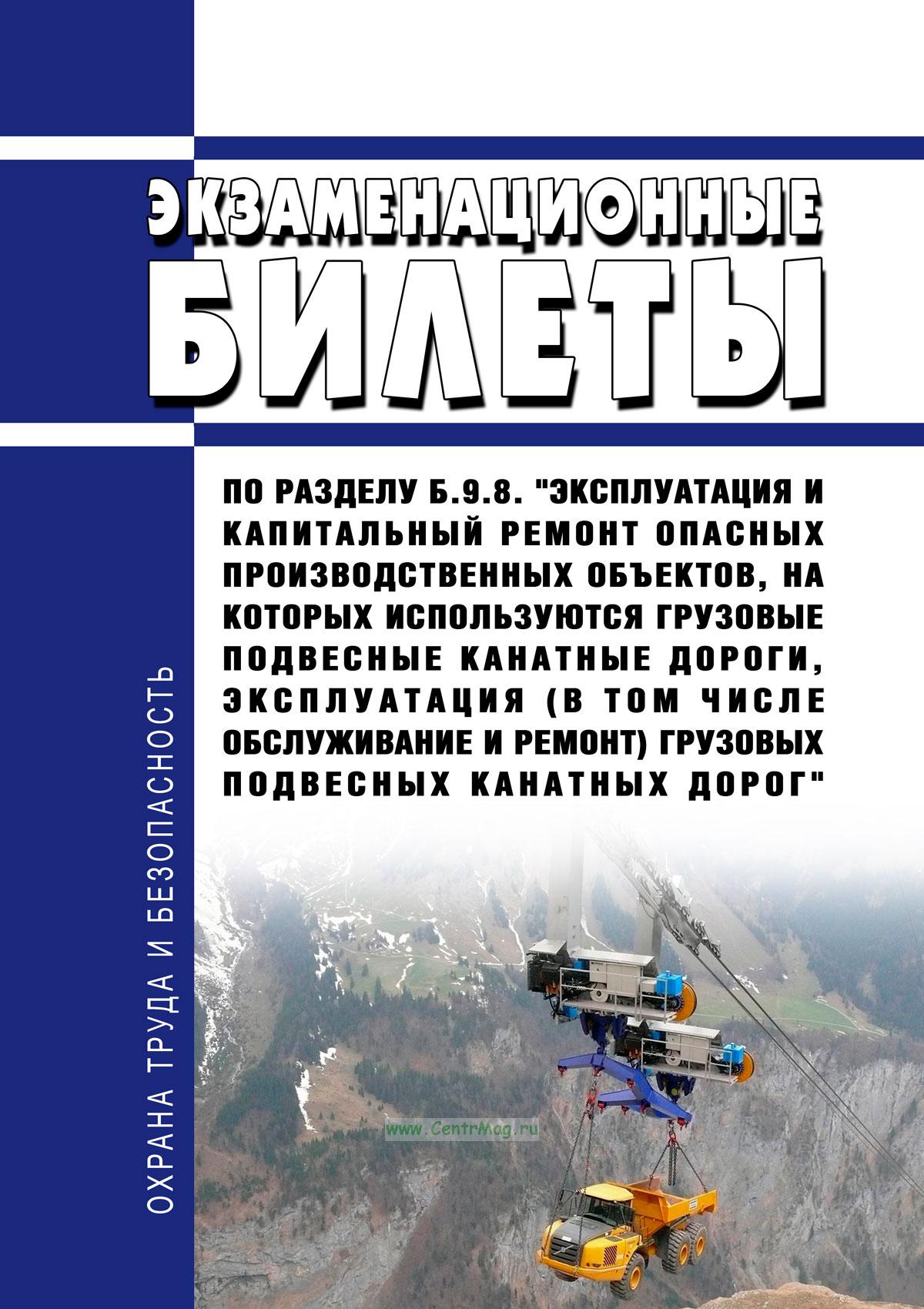 Издание содержит экзаменационные билеты по разделу Б.9.8. "Эксплуатация и капитальный ремонт опасных производственных объектов, на которых используются грузовые подвесные канатные дороги, эксплуатация (в том числе обслуживание и ремонт) грузовых подвесных канатных дорог" с ответами.
