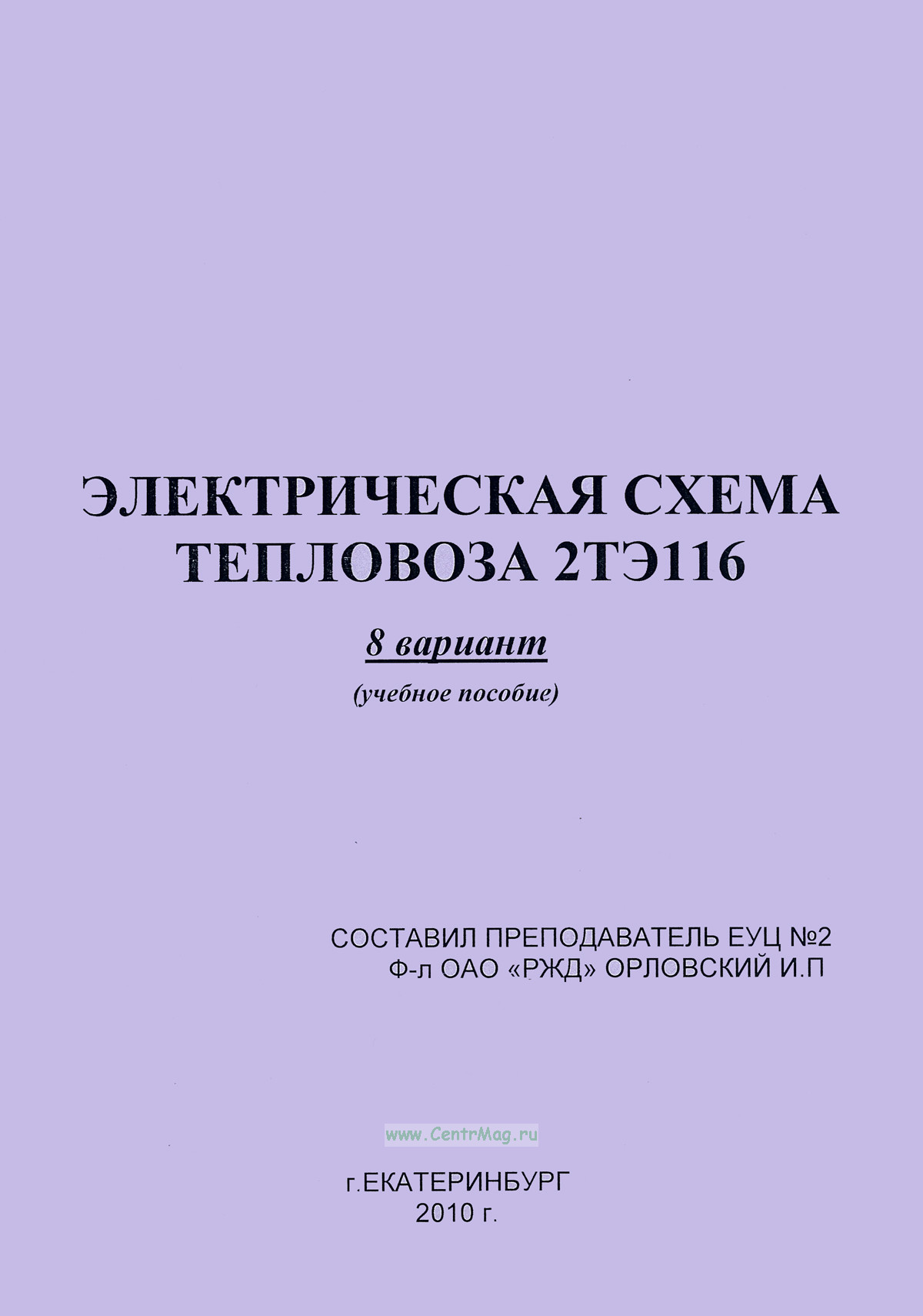 В пособии дано подробное описание одного из последних вариантов электрической схемы тепловоза 2ТЭ116. Пособие предназначено для учащихся железнодорожного лицея, а также может быть использовано для изучения тепловоза работниками локомотивных бригад и слесарями по ремонту электрооборудования тепловозов.