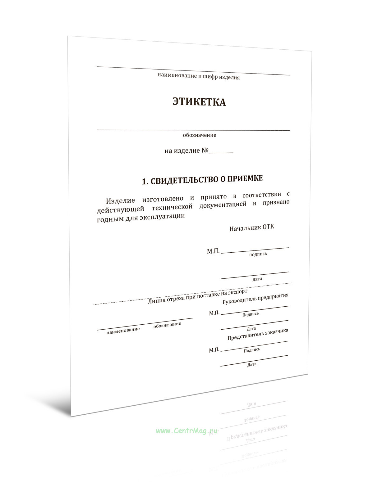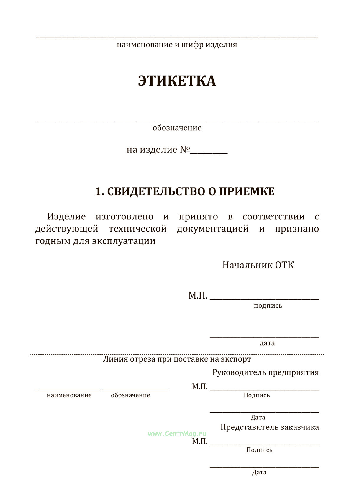 Этикетка используется для подтверждения приемки продукции, а также для предоставления основных технических данных и условий эксплуатации. Этикетка включает информацию о гарантийных обязательствах, сроках хранения, консервации и расконсервации изделия, а также о его движении в эксплуатации.