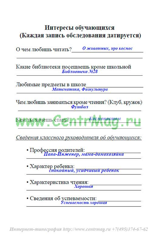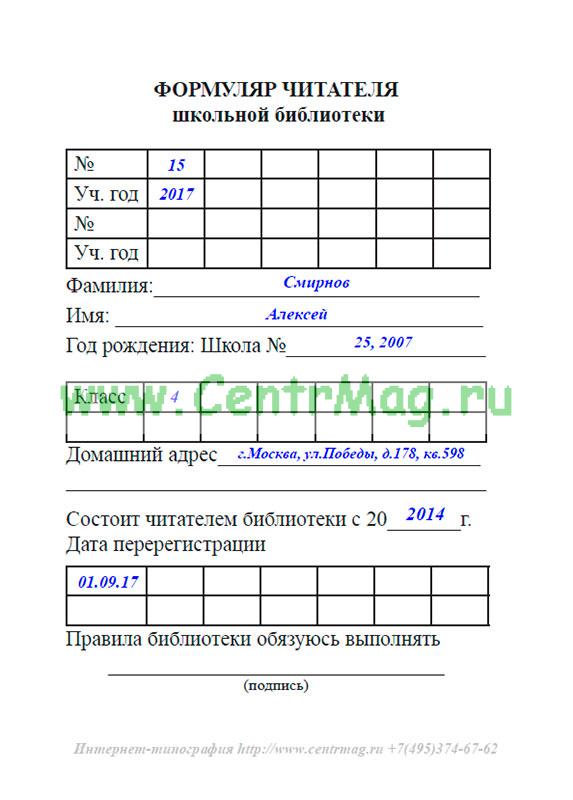 Образец и пример заполнения Формуляра читателя школьной библиотеки
