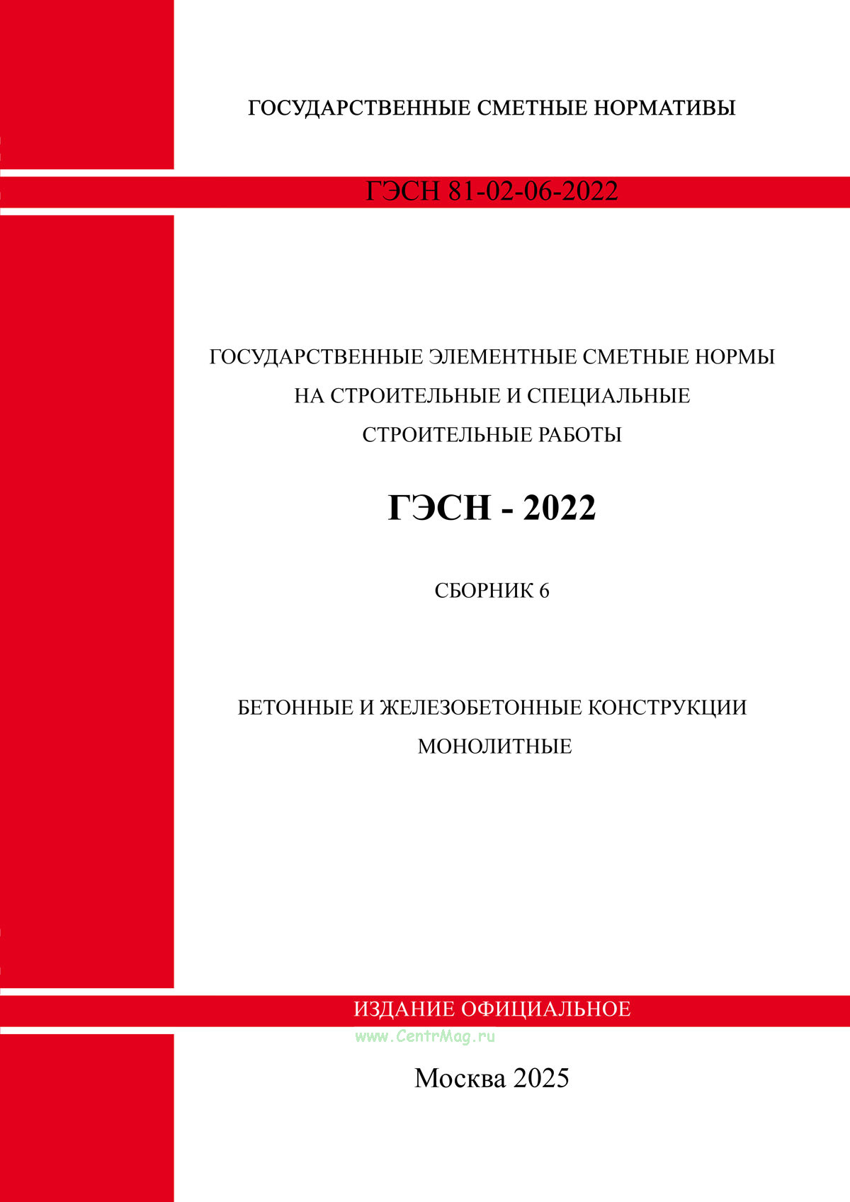ГЭСН 81-02-06-2022 "Сметные нормы на строительные работы. Сборник 6. Бетонные и железобетонные конструкции монолитные" утв. Приказом Минстроя России от 30.12.2021 N 1046/пр.