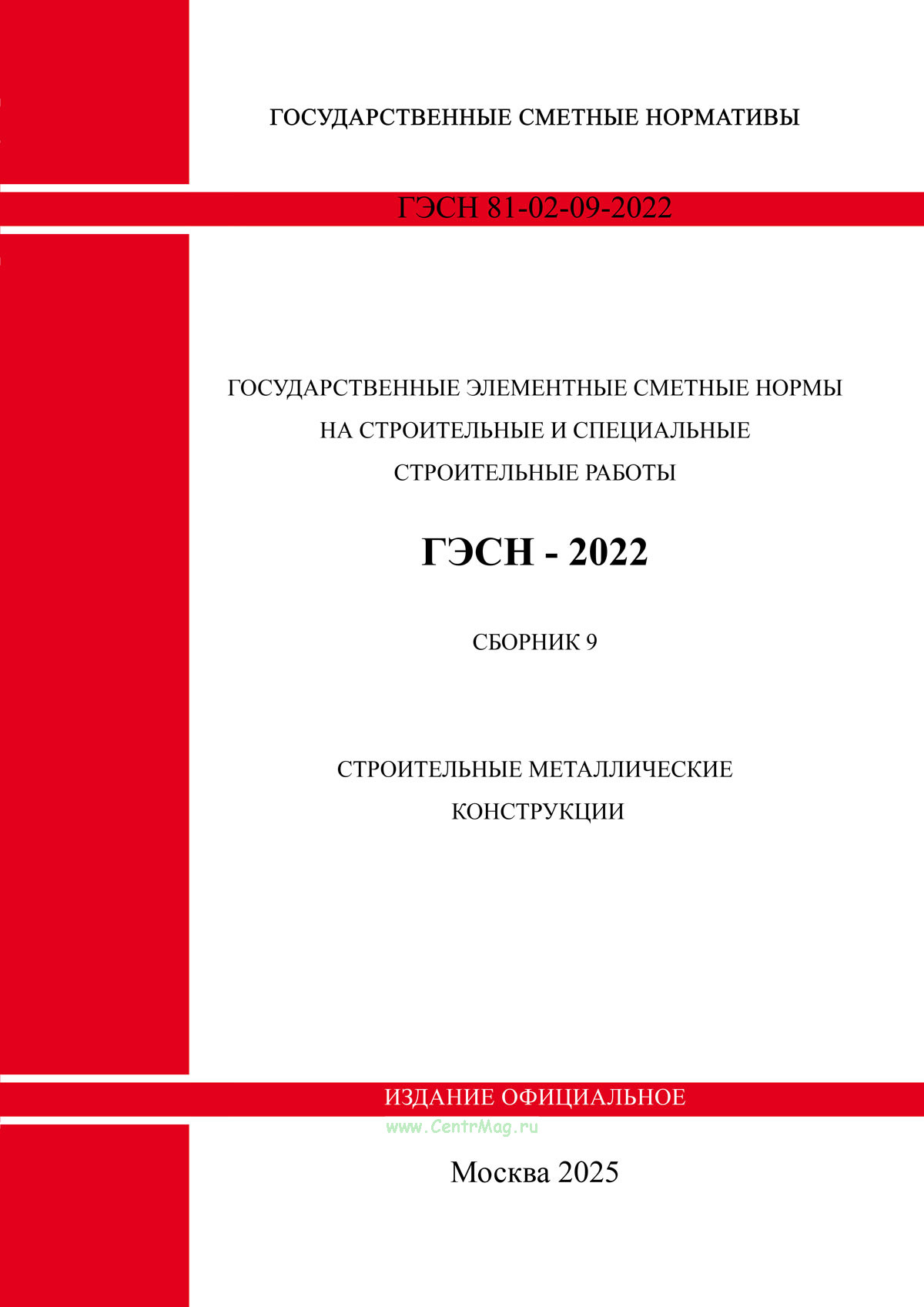 "ГЭСН 81-02-09-2022. Сметные нормы на строительные работы. Сборник 9. Строительные металлические конструкции"; утв. Приказом Минстроя России от 30.12.2021 N 1046/пр