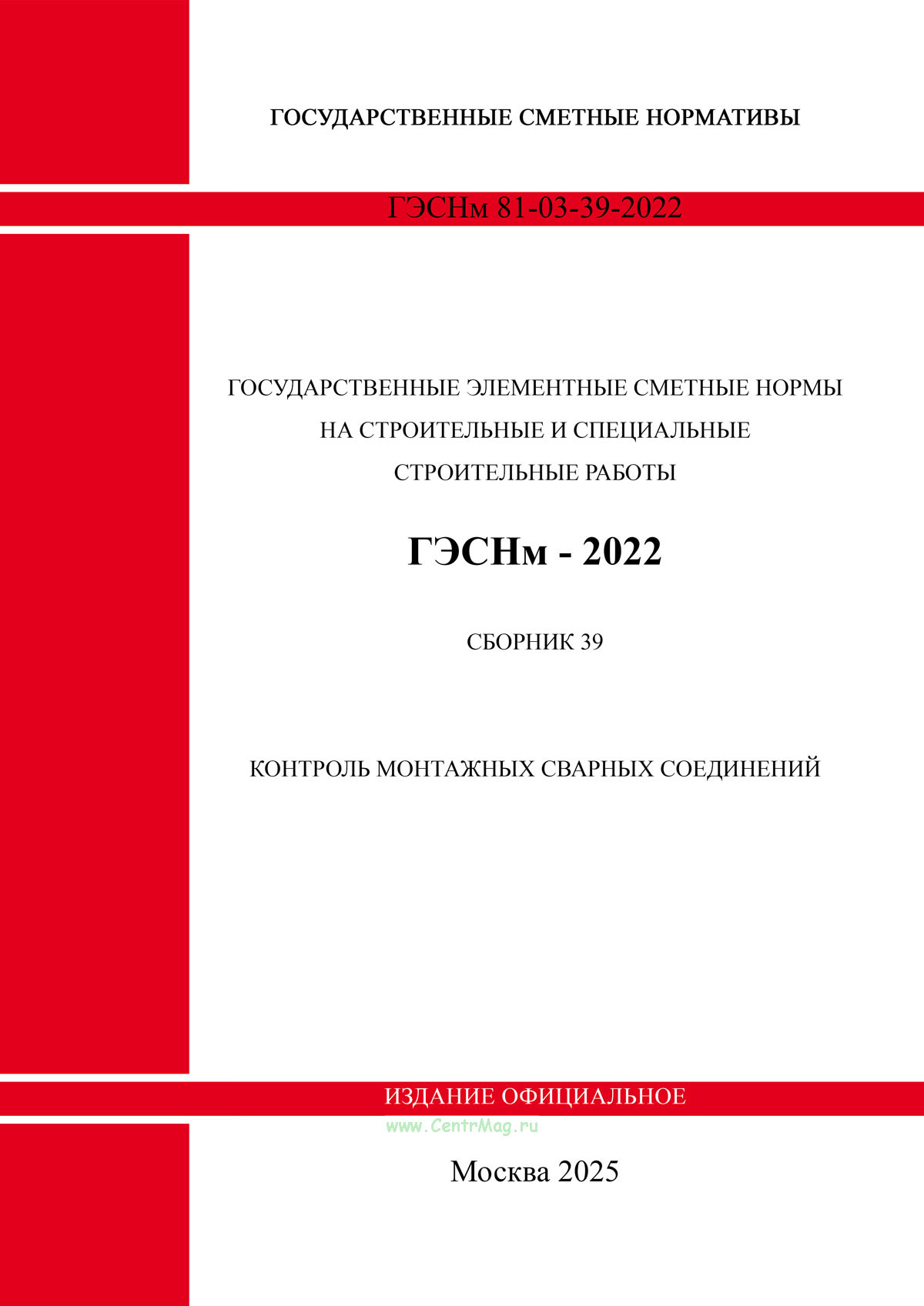 "ГЭСНм 81-03-39-2022 Сборник 39. Контроль монтажных сварных соединений" утв. Приказом Минстроя России от 30.12.2021 N 1046/пр.