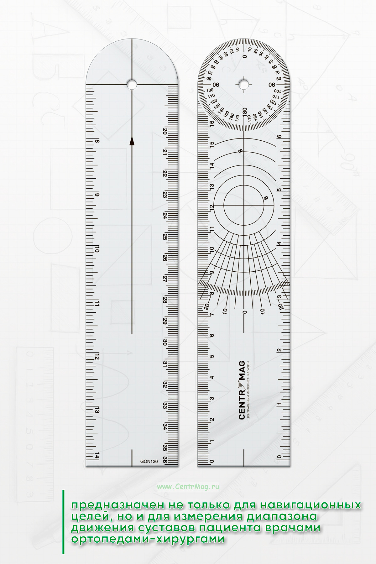 Гониометр предназначен не только для навигационных целей, но и для измерения диапазона движения суставов пациента врачами ортопедами-хирургами. Состоит из двух пластин (линеек), закрепленных вместе на одной оси, остающихся подвижными на этой оси.
