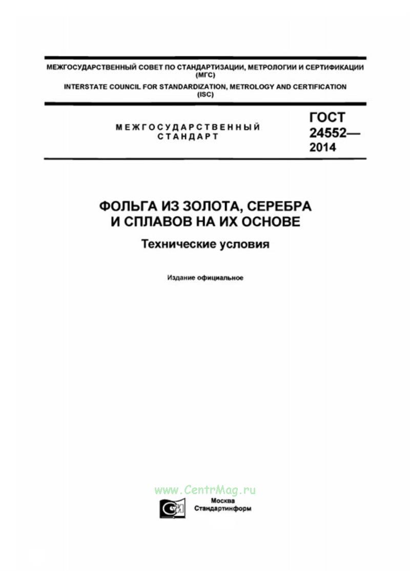 ГОСТ 24552-2014 "Фольга из золота, серебра и сплавов на их основе. Технические условия" утв. Межгосударственным советом по стандартизации, метрологии и сертификации от 20 октября 2014 г. N 71-П