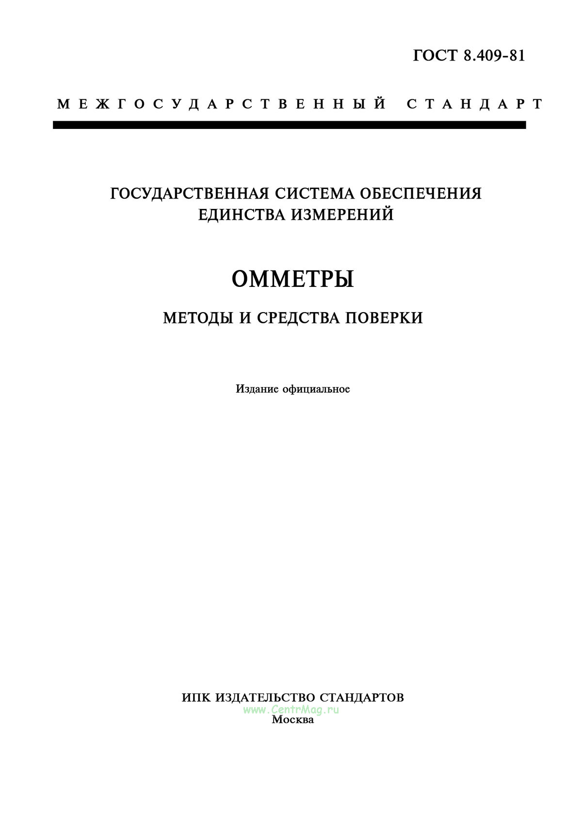 "ГОСТ 8.409-81. Государственный стандарт Союза ССР. Государственная система обеспечения единства измерений. Омметры. Методы и средства поверки" утв. и введен в действие Постановлением Госстандарта СССР от 15.01.1981 N 12