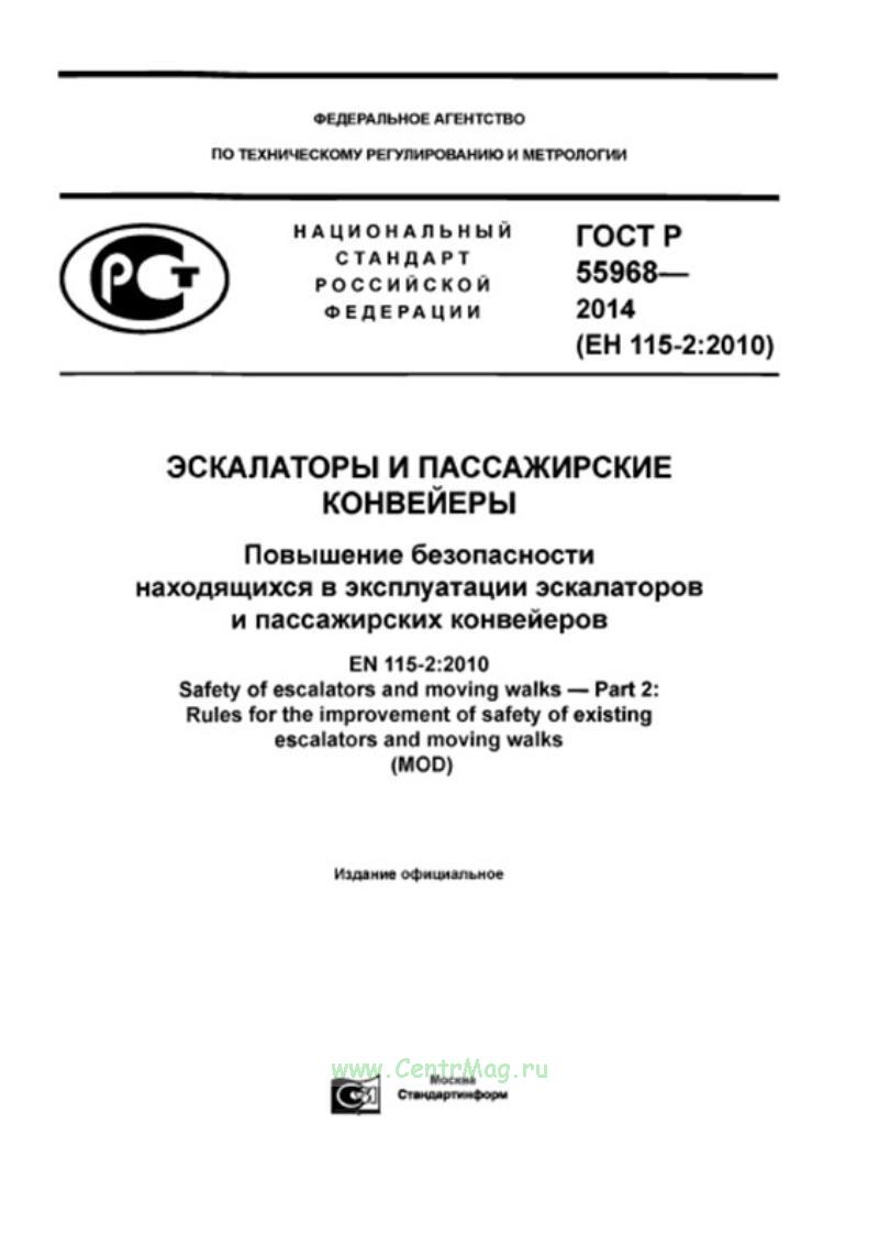 ГОСТ Р 55968-2014 "Эскалаторы и пассажирские конвейеры. Повышение безопасности находящихся в эксплуатации эскалаторов и пассажирских конвейеров" утв. Приказом Федерального агентства по техническому регулированию и метрологии от 6 марта 2014 г. N 97-ст
