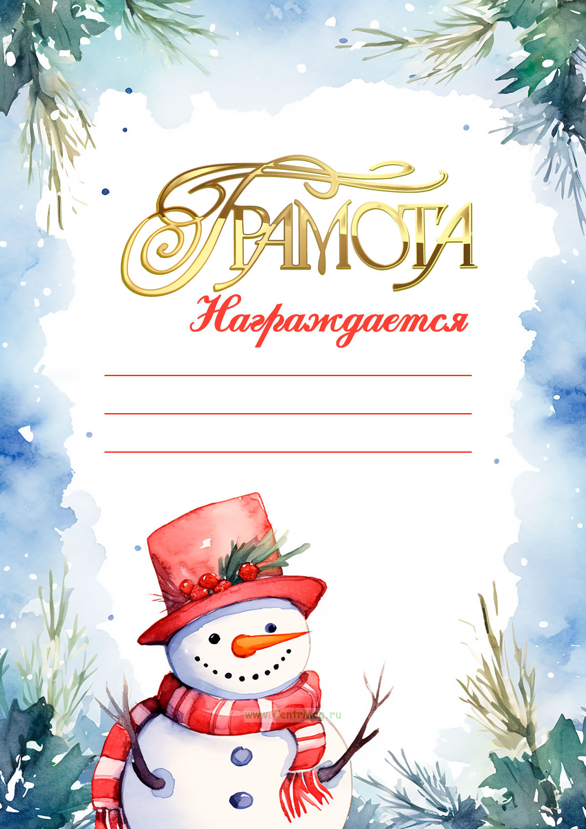 Грамота "Награждается" новогодняя (Снеговик в красной шляпке)