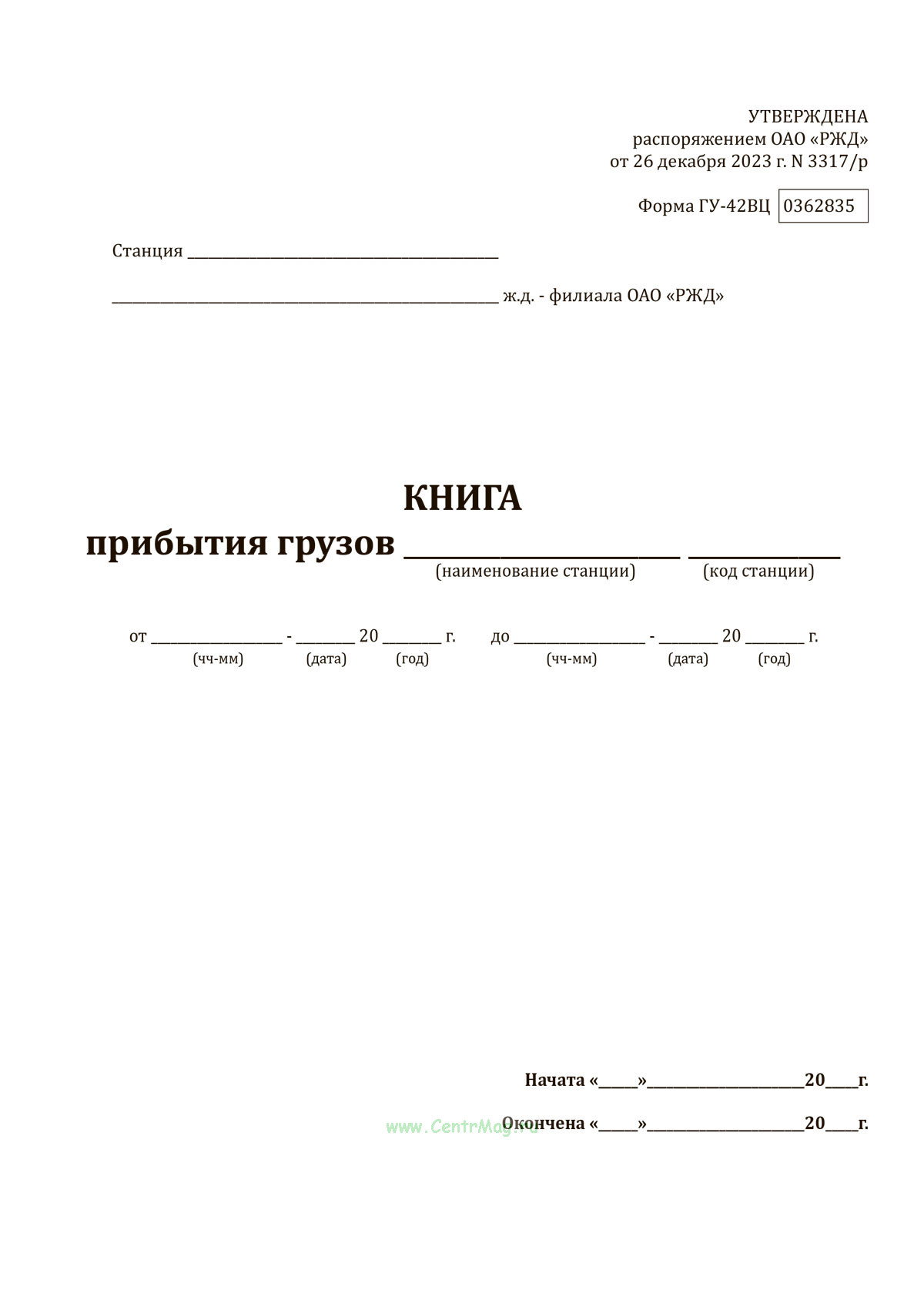 Форма Книги прибытия грузов (ГУ-42ВЦ) утверждена Распоряжением ОАО "РЖД" от 26.12.2023 N 3317/р.