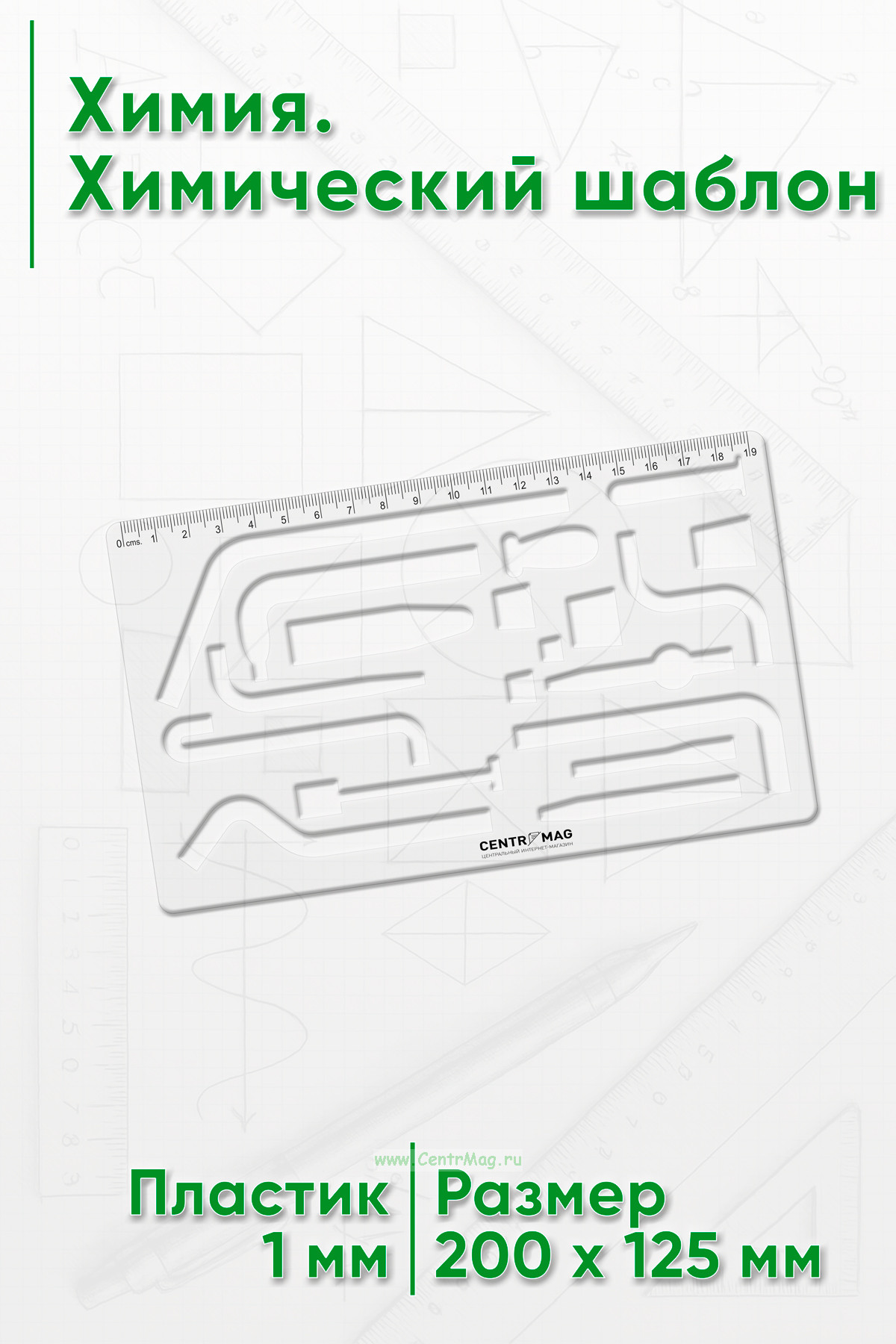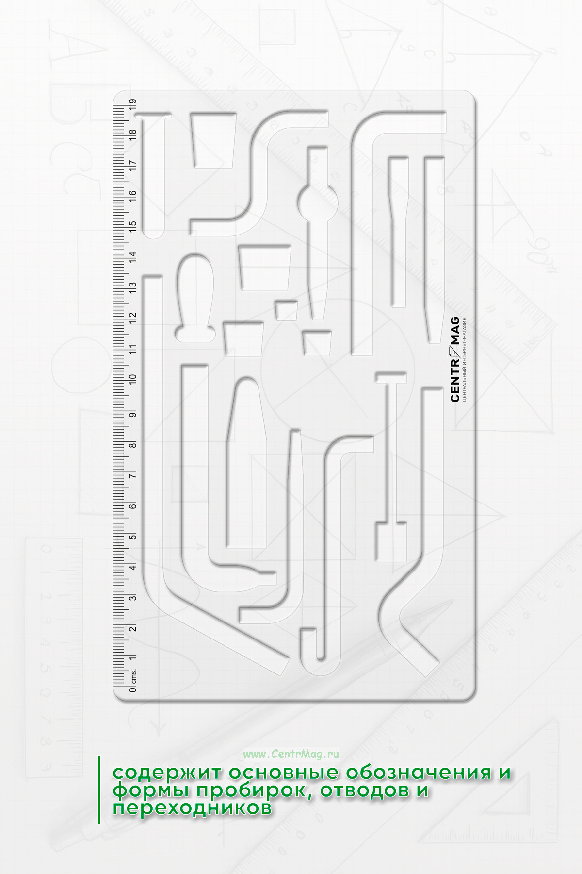 Шаблон содержит основные обозначения и формы пробирок, отводов и переходников. Сделан из прозрачного пластика.