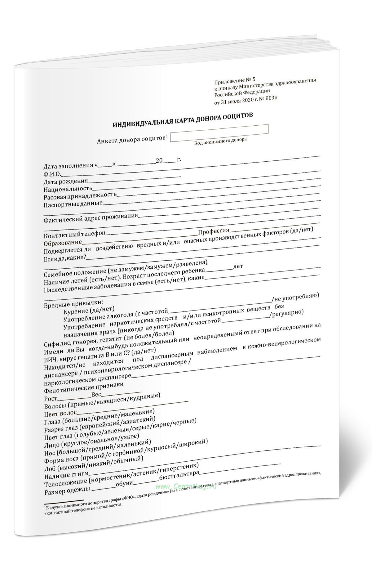 Форма индивидуальной карты донора ооцитов соответствует Приложению № 5 к Приказу Министерства здравоохранения РФ от 31 июля 2020 г. № 803н "О порядке использования вспомогательных репродуктивных технологий, противопоказаниях и ограничениях к их применению"