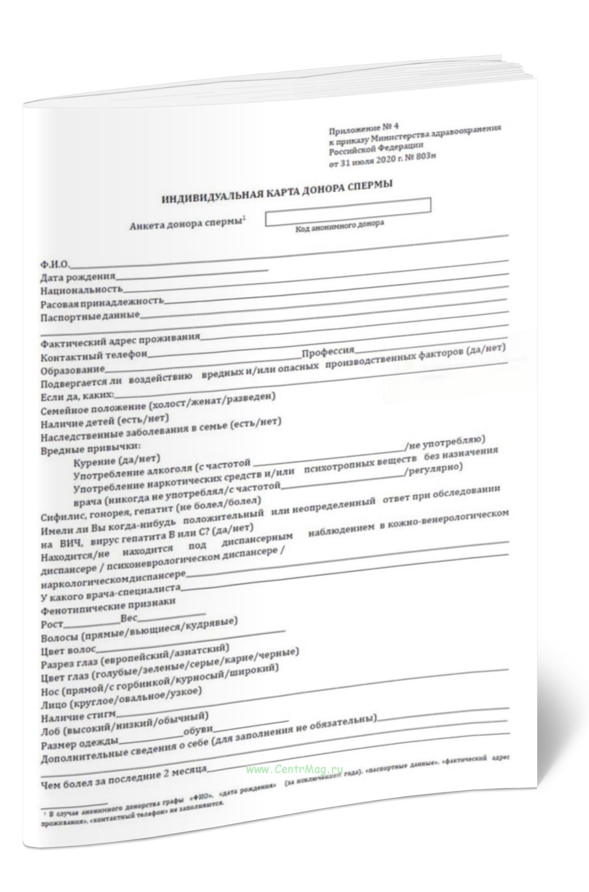 Форма индивидуальной карты донора спермы соответствует Приложению № 4 к Приказу Министерства здравоохранения РФ от 31 июля 2020 г. № 803н "О порядке использования вспомогательных репродуктивных технологий, противопоказаниях и ограничениях к их применению".