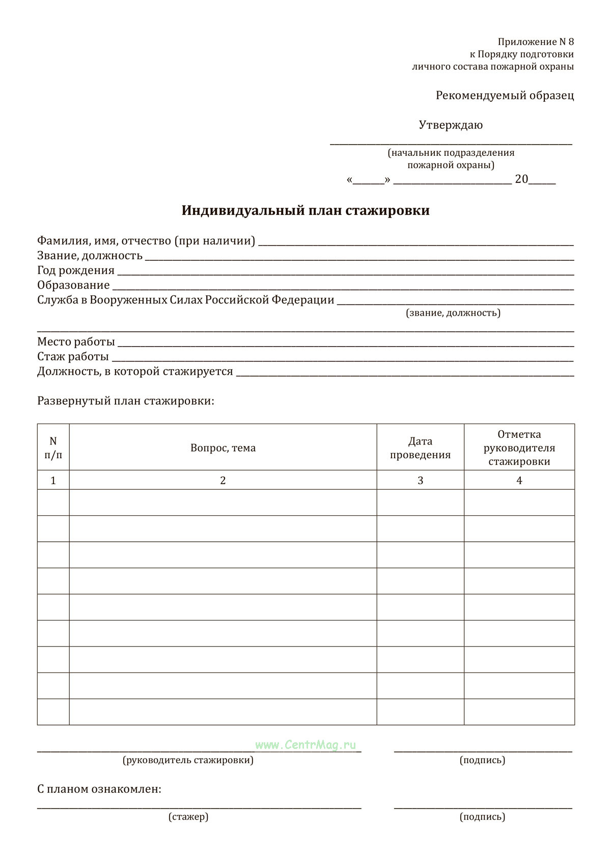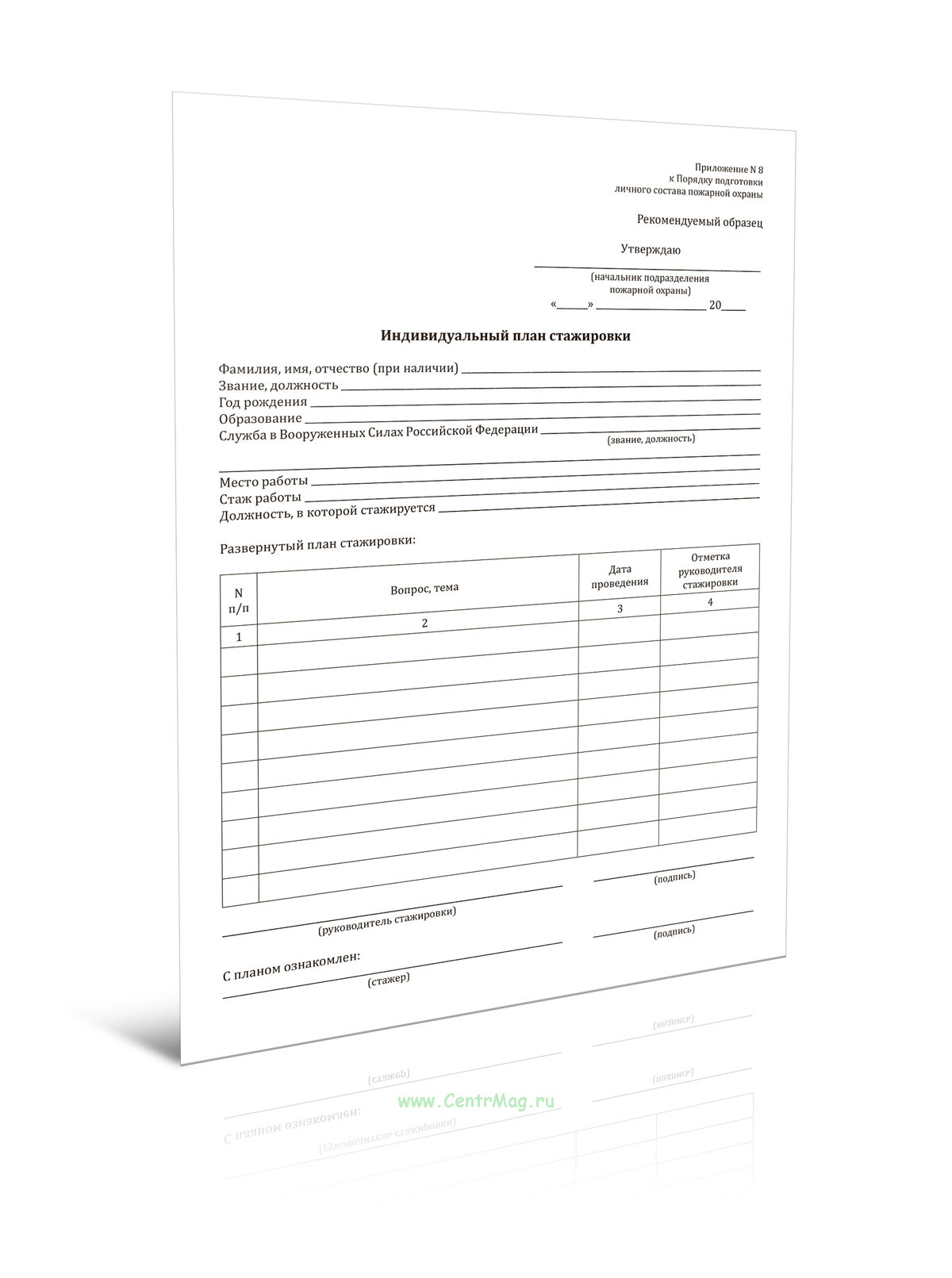 Форма Индивидуального плана стажировки соответствует Приложению N 8 к Приказу МЧС России от 05.02.2025 N 77 "Об утверждении Порядка подготовки личного состава пожарной охраны"