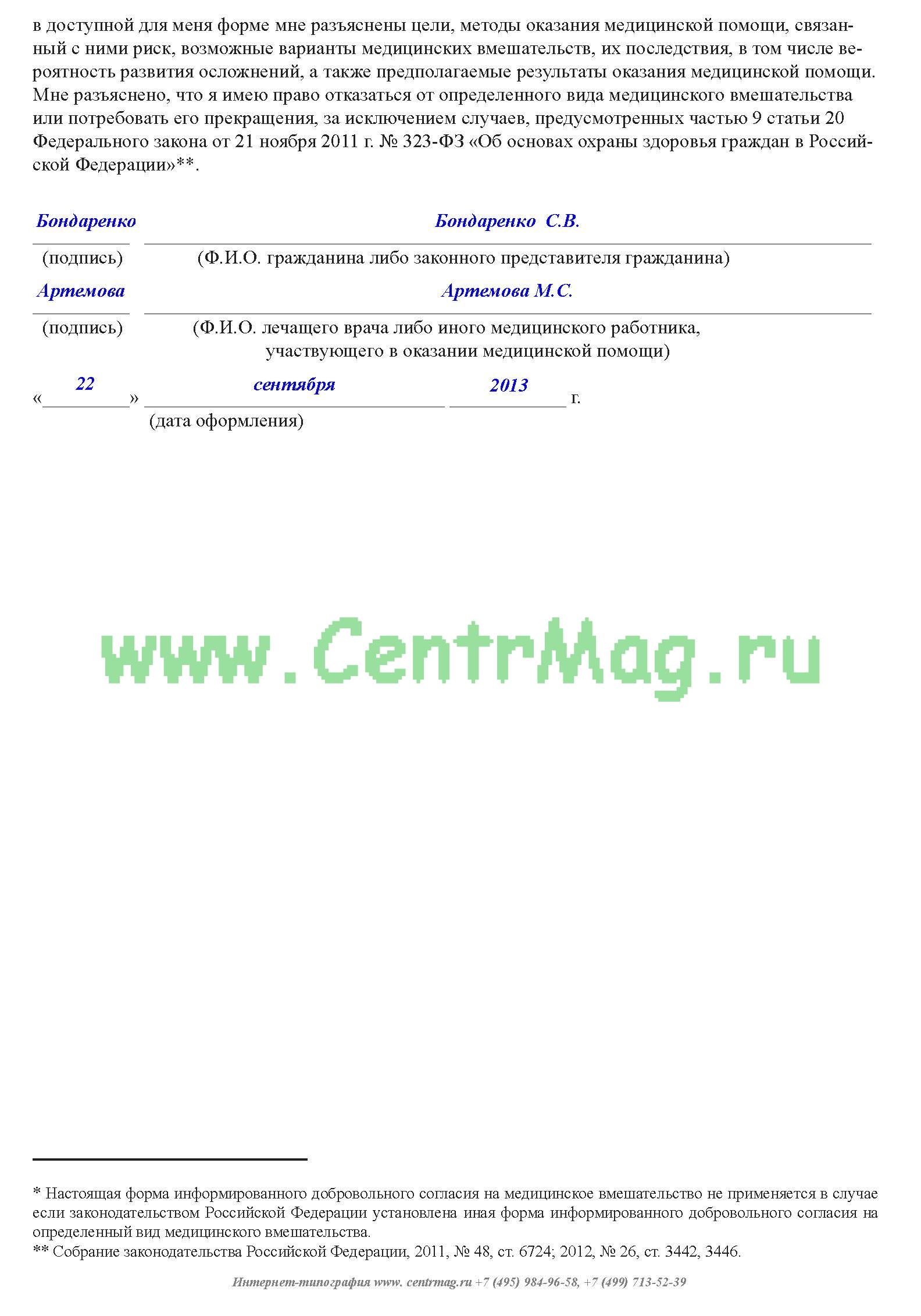 Информированное добровольное согласие на медицинское вмешательство соответствует Федеральному Закону № 323 от 21.11.2011г. «Об основах охраны здоровья граждан в РФ».