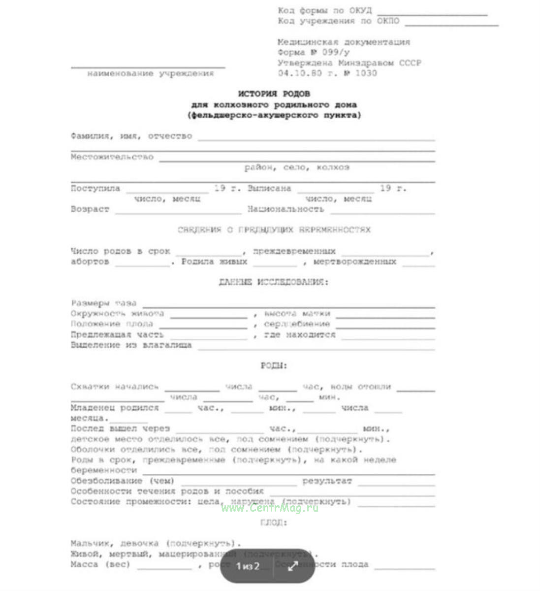 Форма истории родов для колхозного роддома, фельдшерско-акушерского пункта (Форма 099/у) утверждена Приказом Минздрава СССР № 1030 «Об утверждении форм первичной медицинской документации учреждений здравоохранения» от 04 октября 1980, который утратил силу.