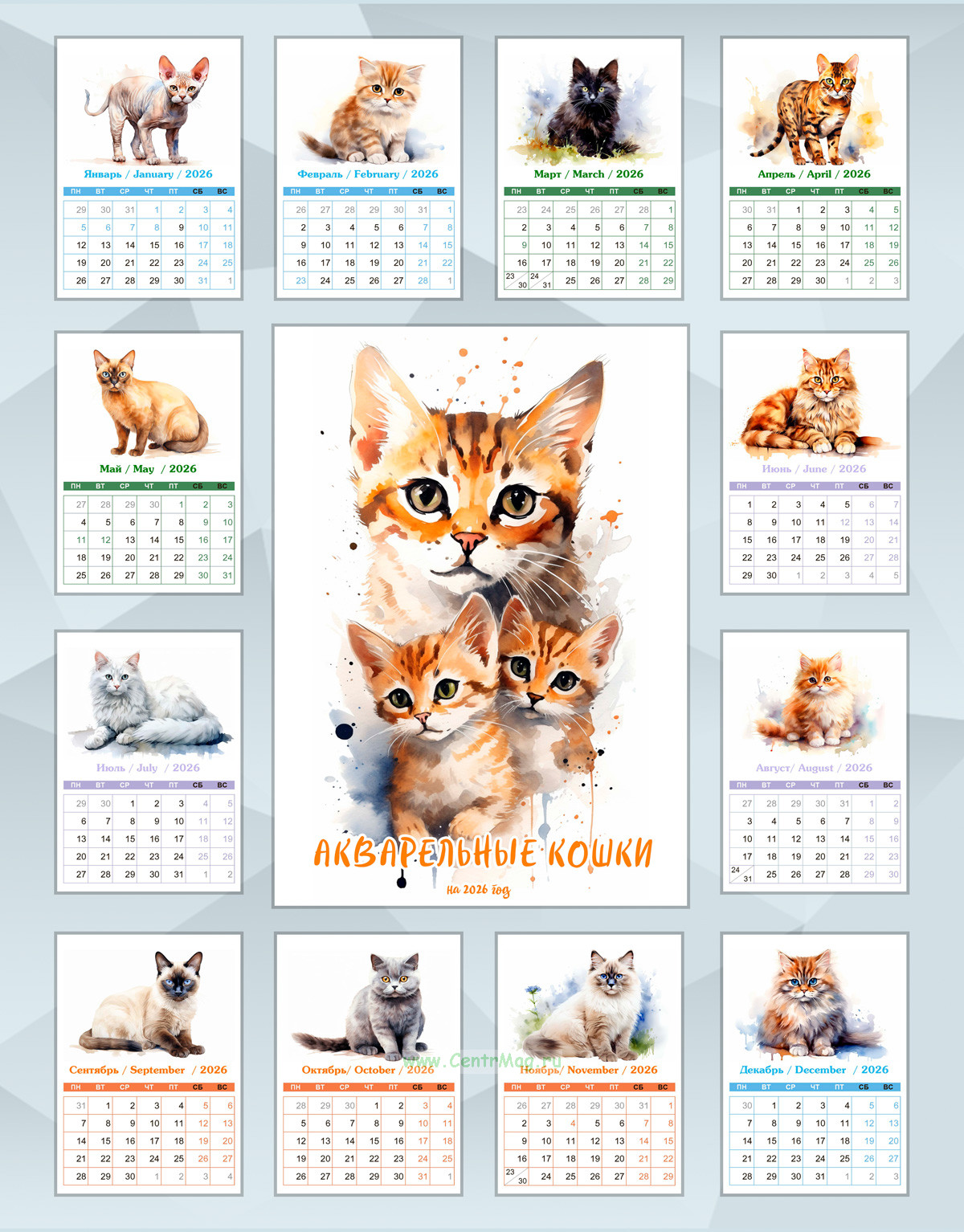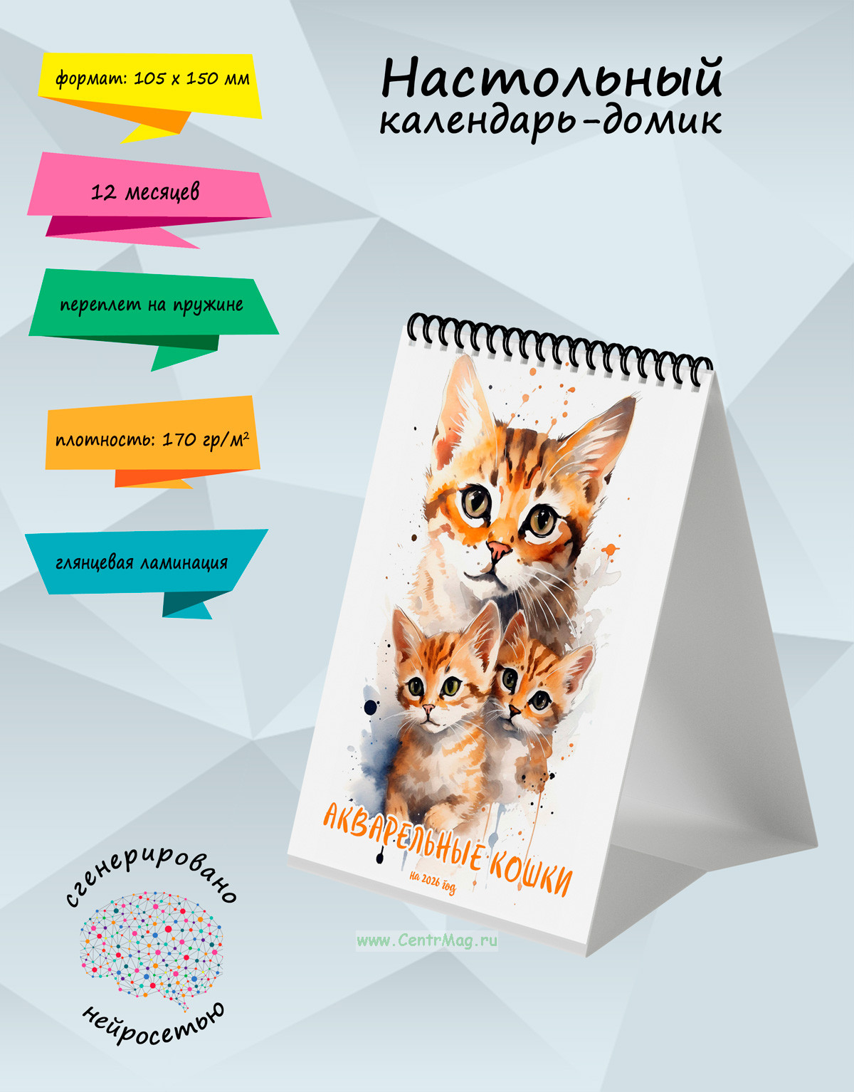 Настольный календарь-домик "Акварельные кошки" на 2026 год