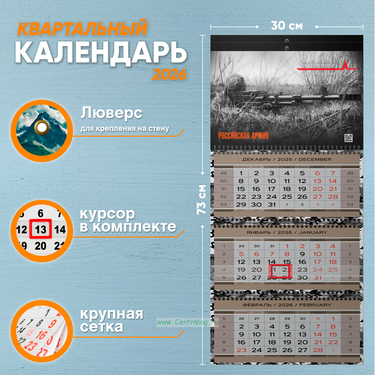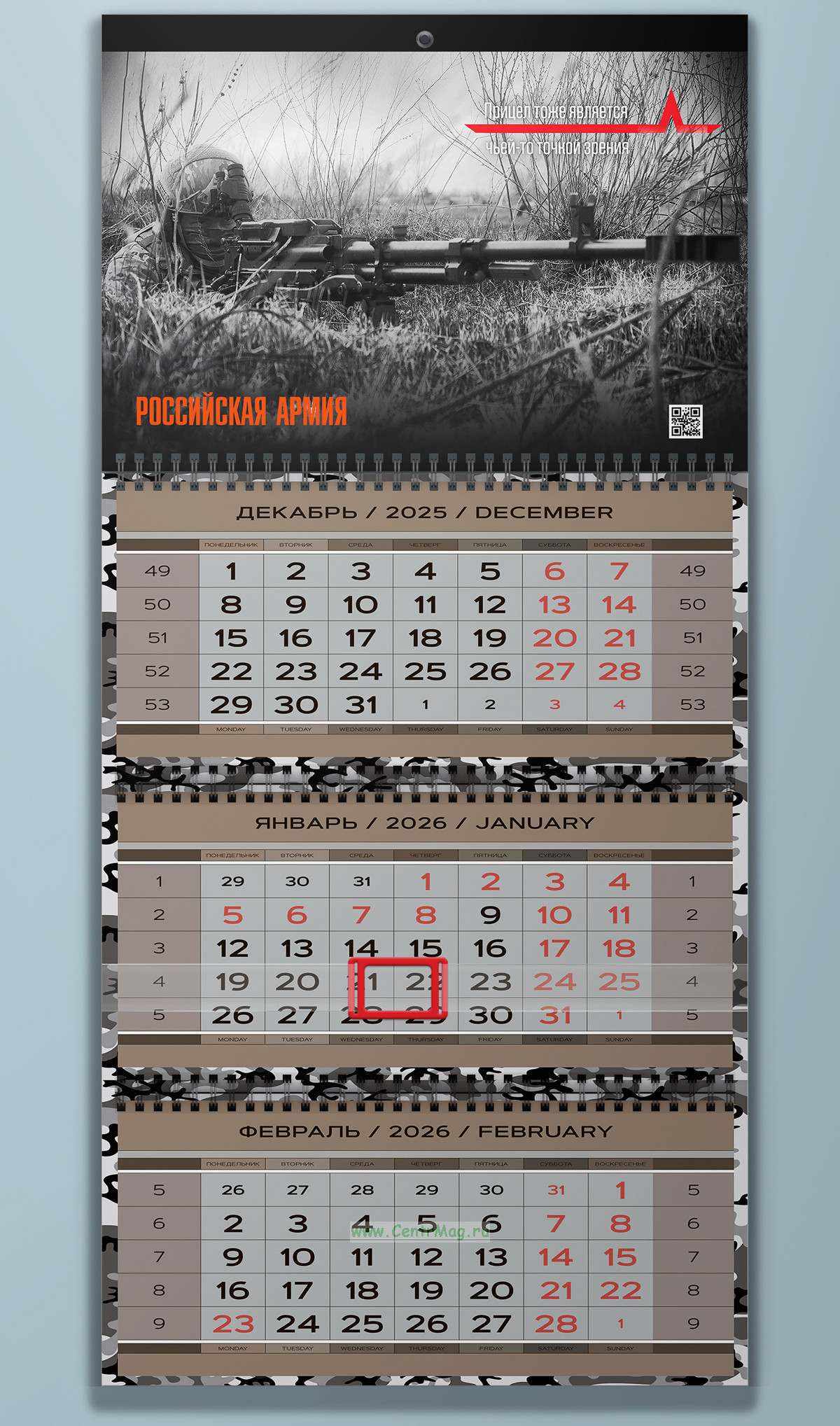 Календарь квартальный "Российская Армия" на 2026 год (надпись: Прицел тоже является чьей-то точкой зрения)
