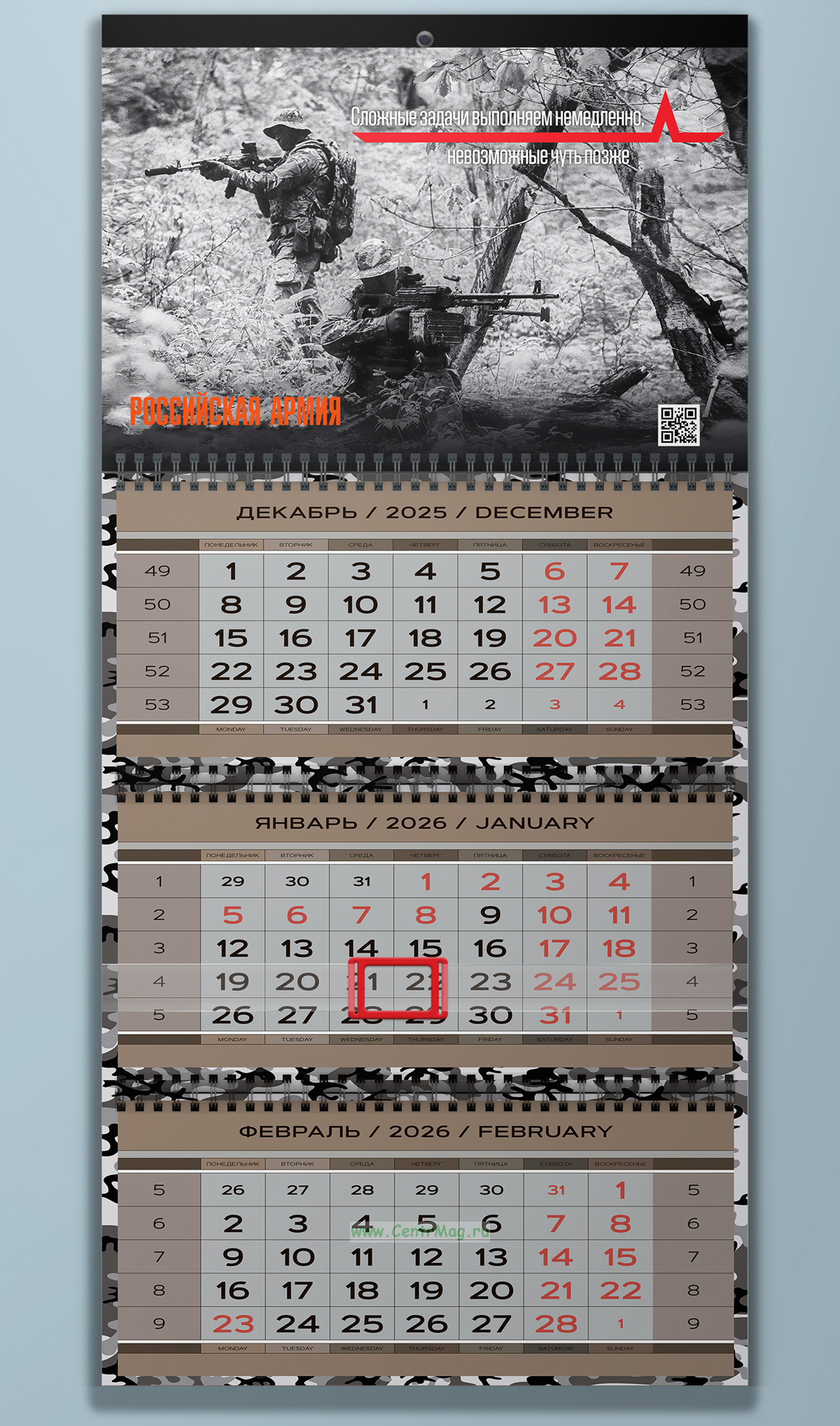 Календарь квартальный "Российская Армия" на 2026 год (надпись: Сложные задачи выполняем немедленно, невозможные чуть позже)