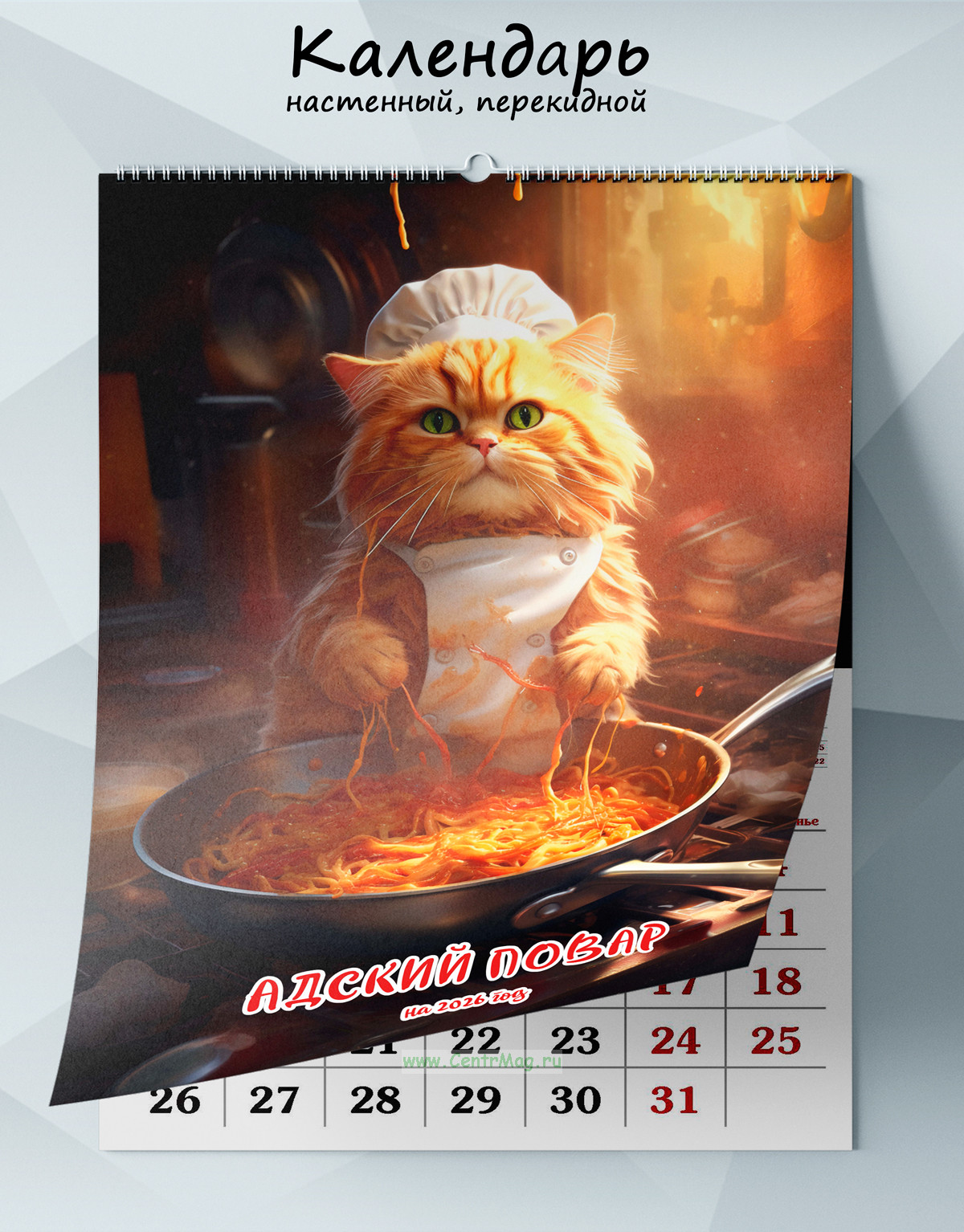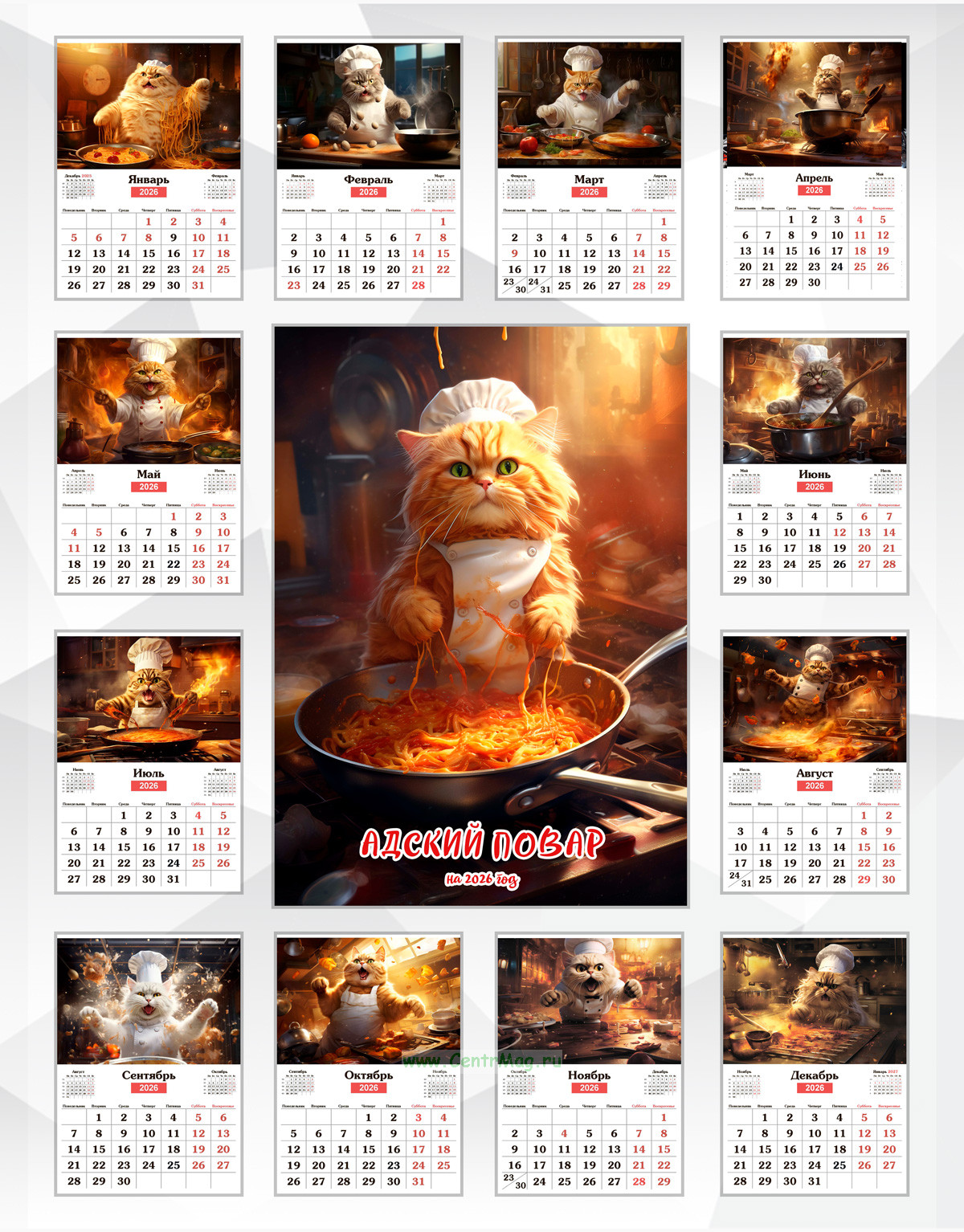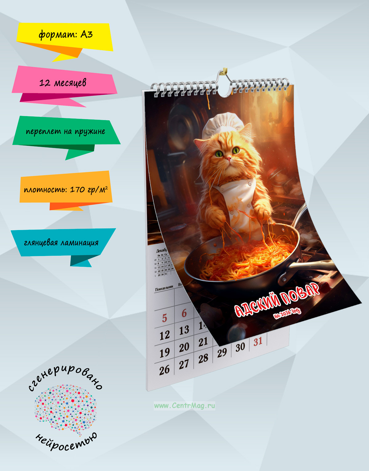 Календарь содержит очаровательные изображения адских котов-поваров. Иллюстрации созданы с помощью искусственного интеллекта. Идеально подойдет в качестве подарка друзьям, родственникам или даже себе.