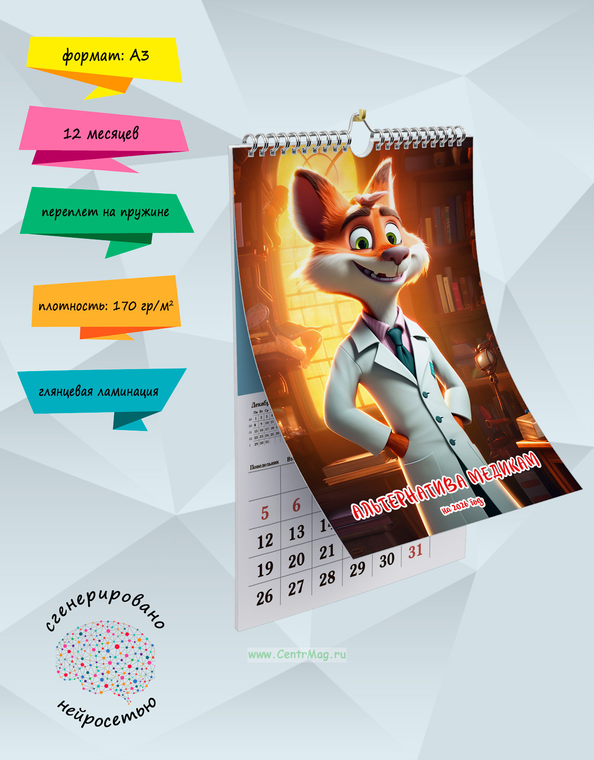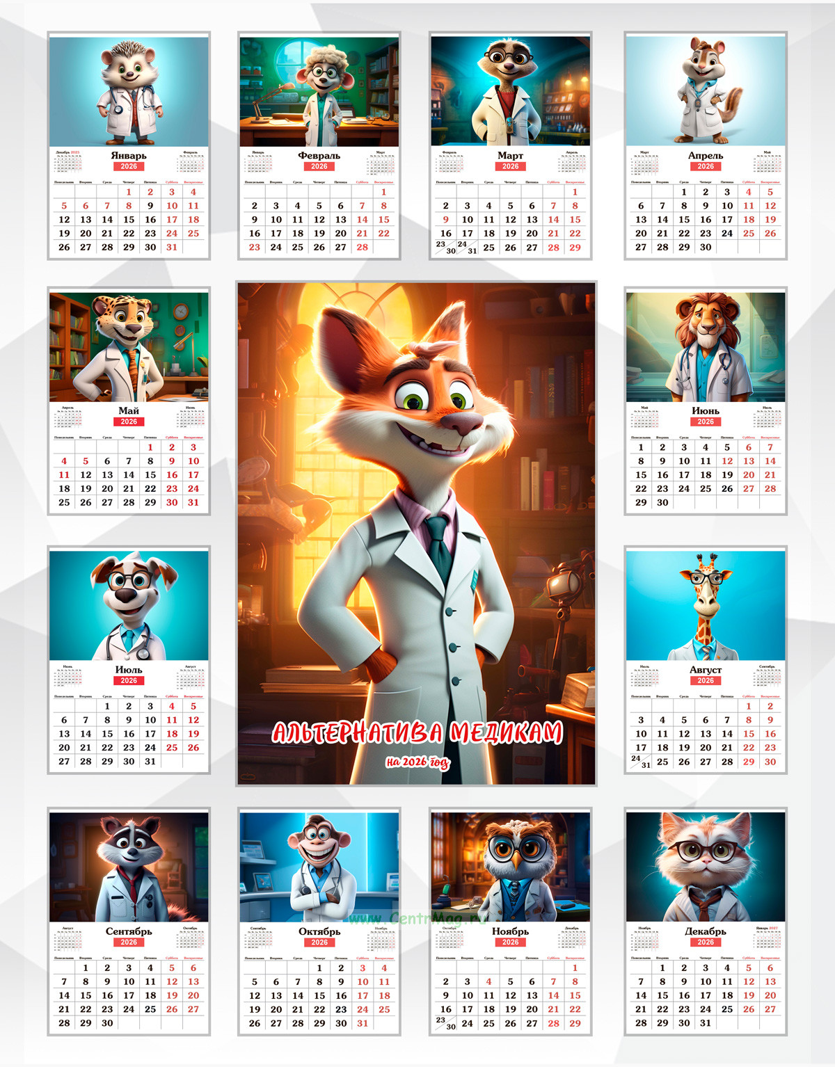 Календарь содержит изображения забавных зверей-врачей. Обложка нарисована с помощью искусственного интеллекта. Мы подготовили для вас прекрасных 12 иллюстраций.
