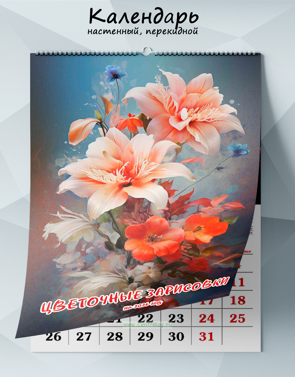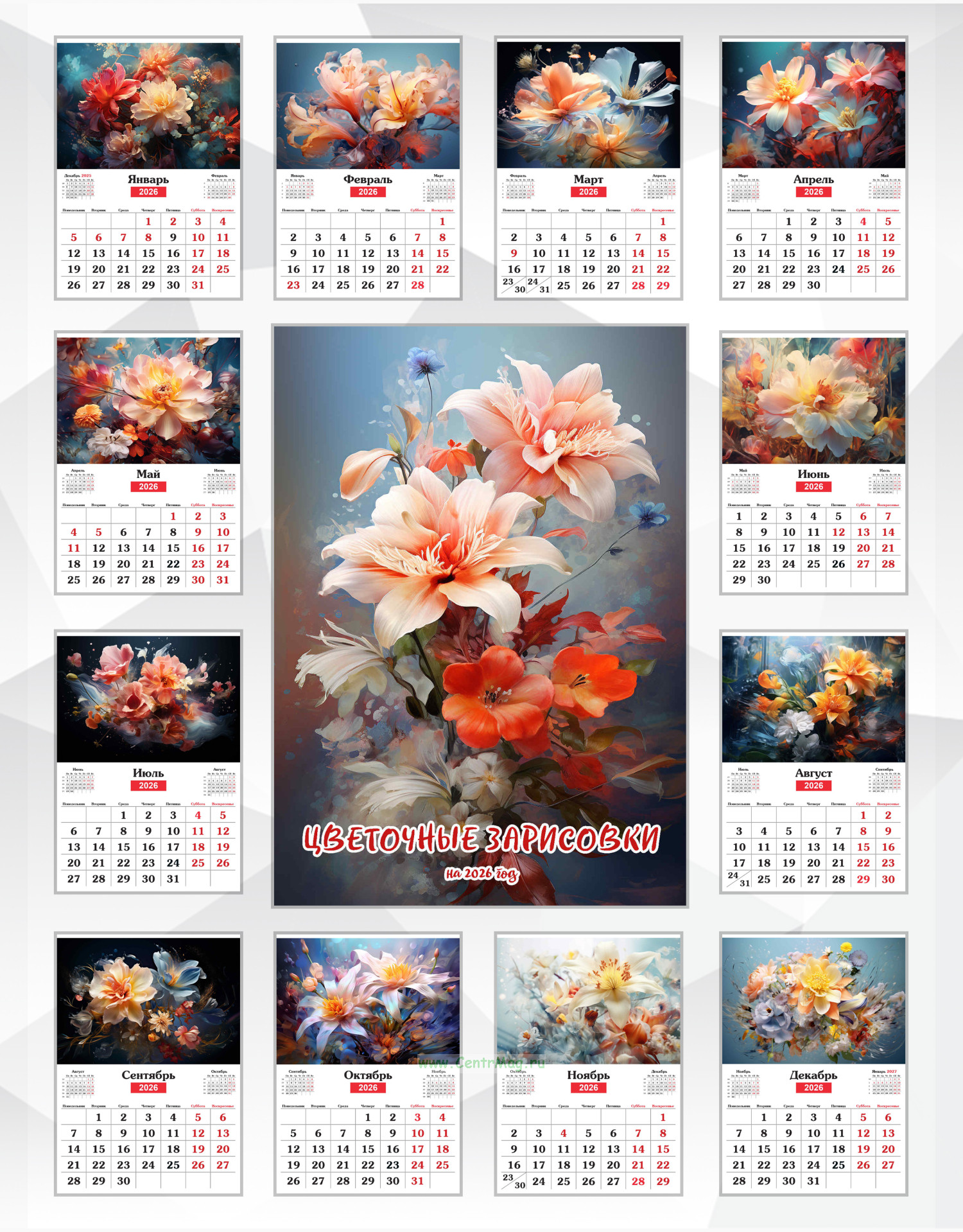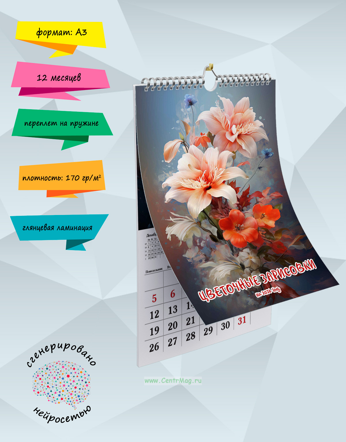 Календарь содержит изображения завораживающих цветов. Обложка нарисована с помощью искусственного интеллекта. Мы подготовили для вас прекрасных 12 иллюстраций.